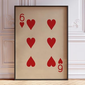Vintage six of spades playing card poster. Printed to order this games room wall art print is available in a large selection of sizes and colours to complement interior decor from contemporary modern, Scandi, antique country farmhouse, vintage art deco and retro boho chic.