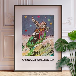 Enhance your nursery room decor with this charming book cover and first verse of the classic nursery rhyme "The Owl and The Cat" by Edward Lear. This vintage style children's wall art print is sure to add a touch of whimsy and nostalgia to any space. Perfect for creating a cozy and inviting atmosphere for your little one.