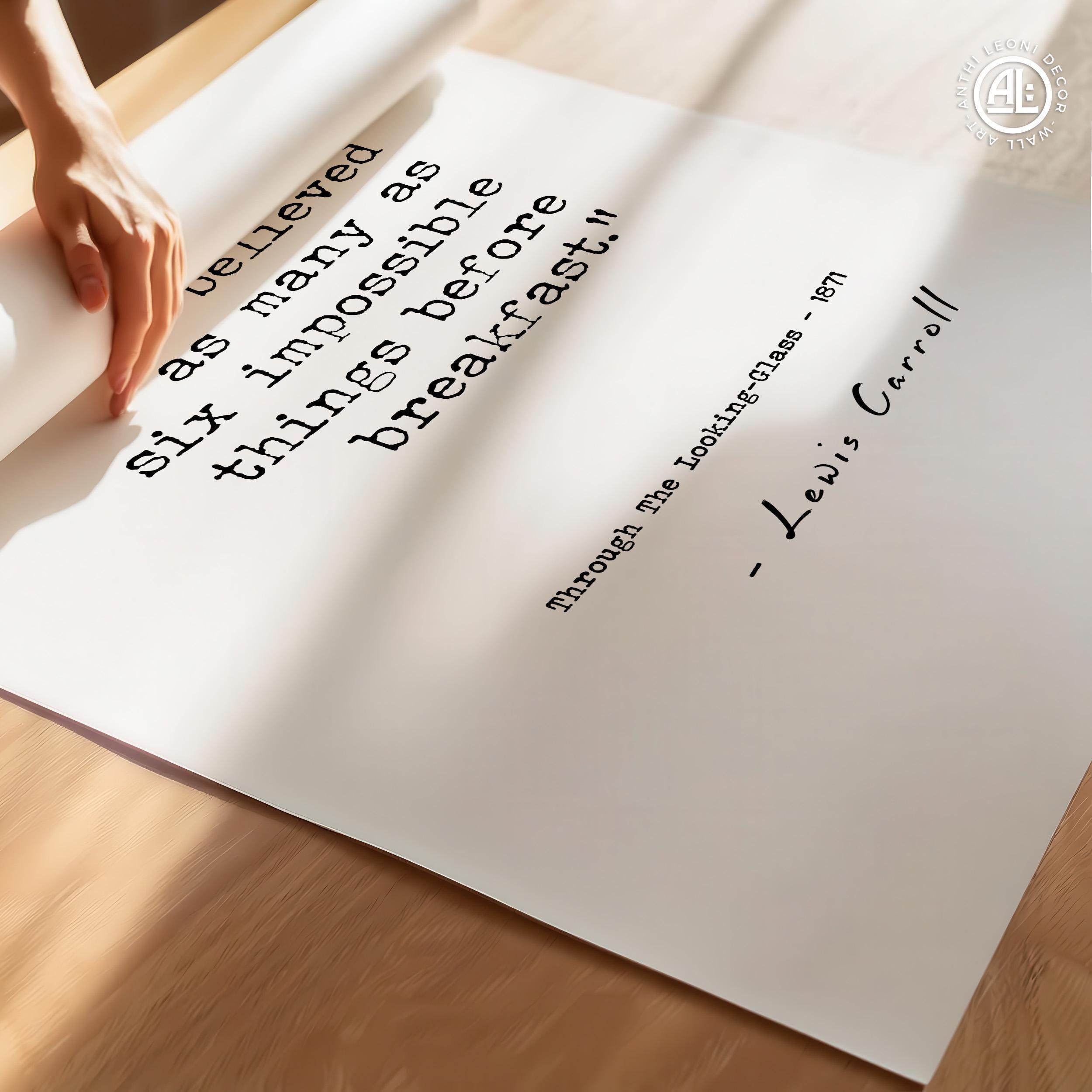 Discover our enchanting Alice Through the Looking-Glass Print, perfect for adding a touch of whimsy to your home decor. Featuring the inspiring quote, "Why, sometimes I've believed as many as six impossible things before breakfast," this bookish wall art is ideal for your reading nook, bedroom, or living space. Crafted with simple typography, this wall decor blends elegance with meaningful quotes about life, making it a versatile piece for all occasions. Bring a touch of literary magic and daily inspiration into your home today!