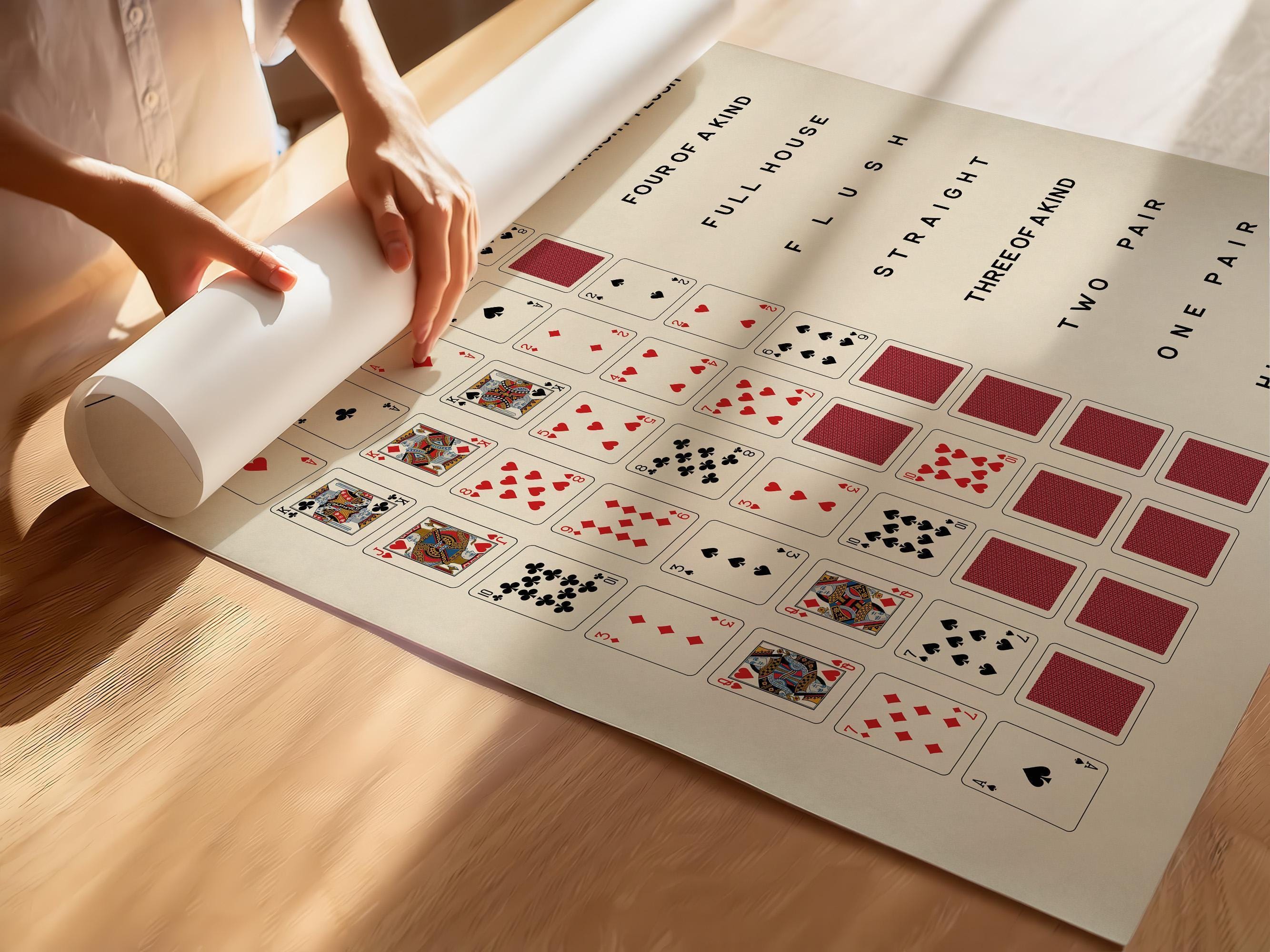 Enhance your gaming space with our exquisite Poker Poster. This Poker Hand Print features a comprehensive guide to Poker Hand Rankings, making it the perfect gift for any avid Poker player. Elevate your decor with this Texas Holdem Poker Chart, designed to add a touch of sophistication to any room.