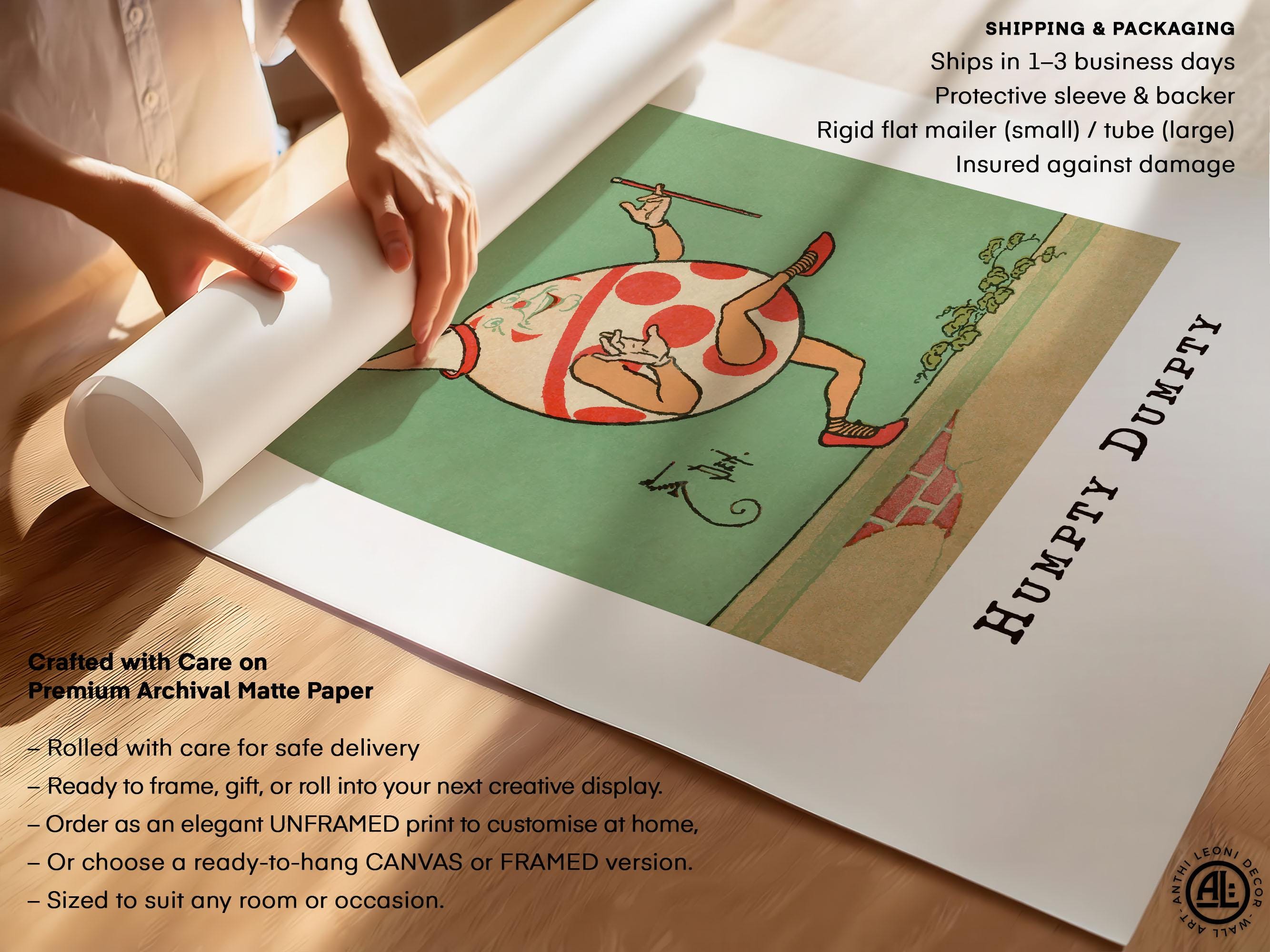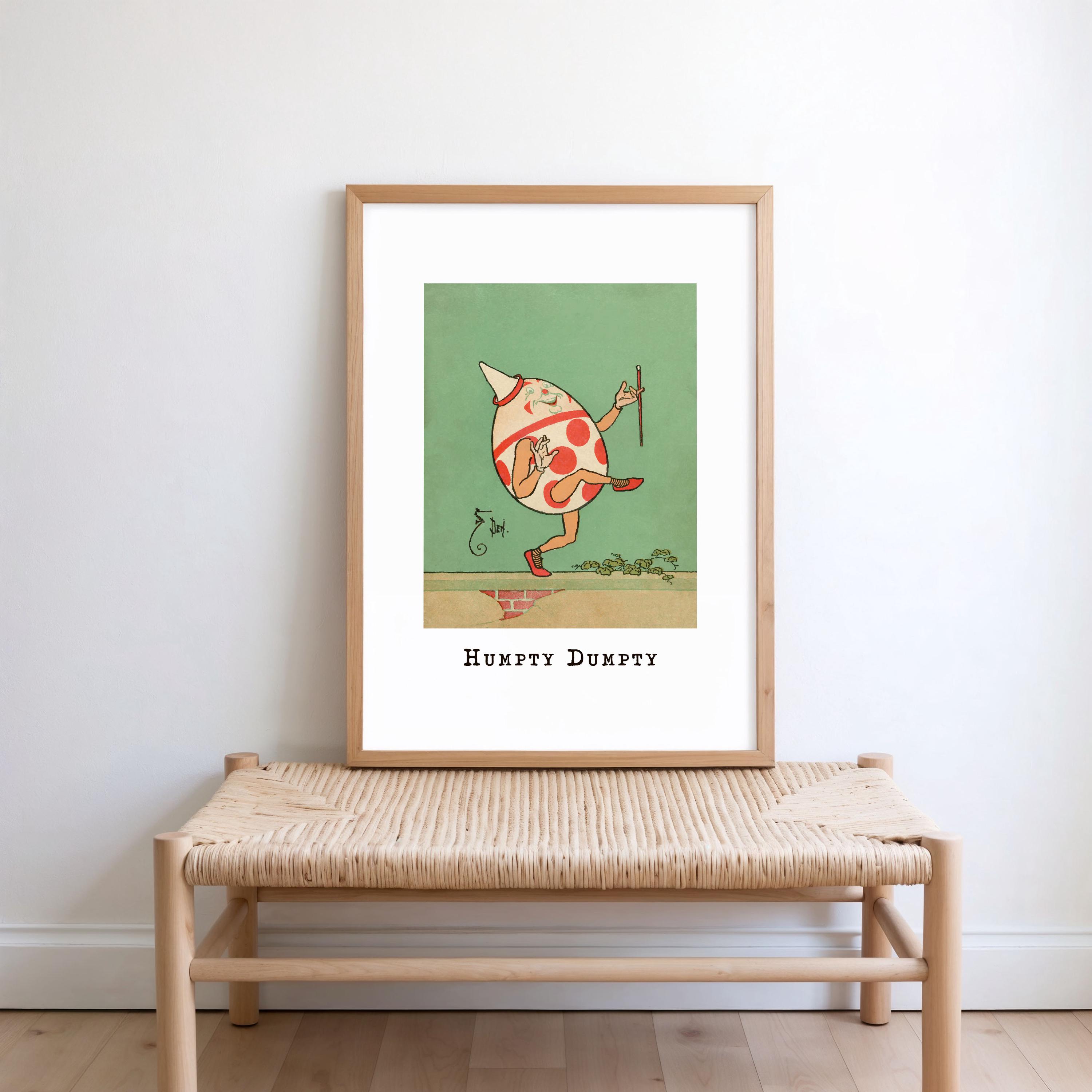 Humpty Dumpty - Enhance your nursery room decor with a charming retro-style nursery wall art featuring the beloved Humpty Dumpty nursery rhyme. This poster print is created from a remastered original children's book page, adding a touch of nostalgia to your space. Available in a variety of sizes and paper colours, this picture is the perfect addition to any nursery. Elevate your child's room with this timeless piece of art.