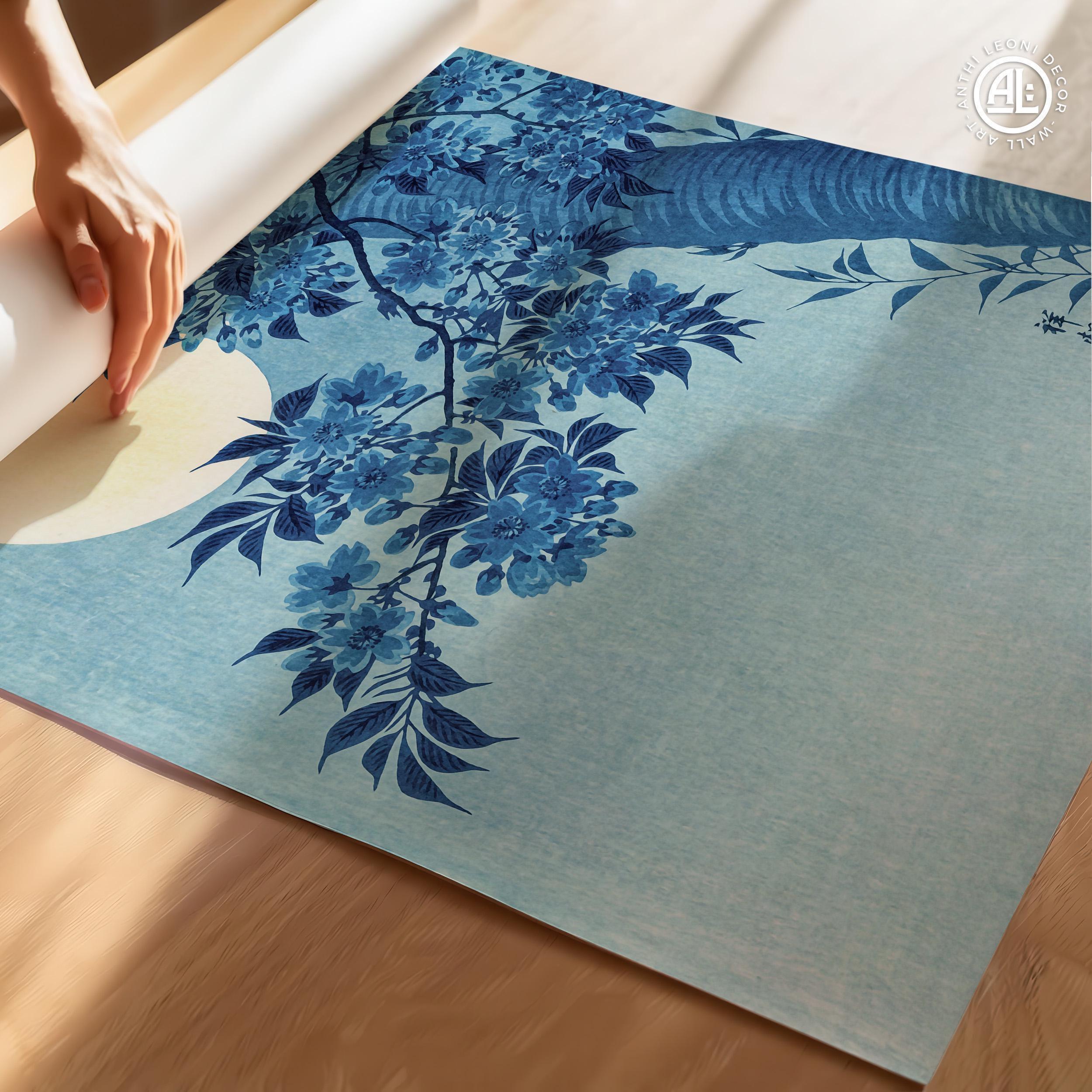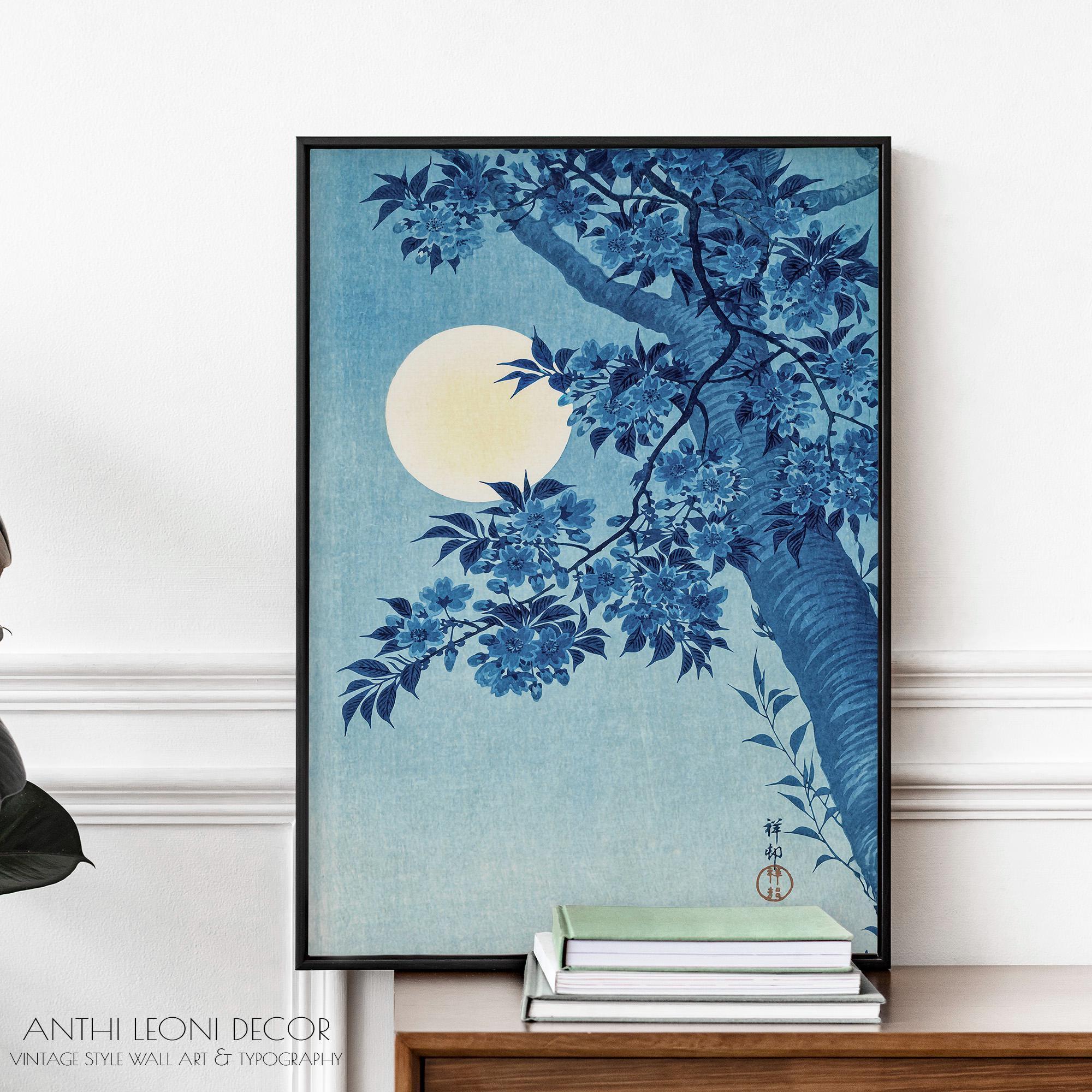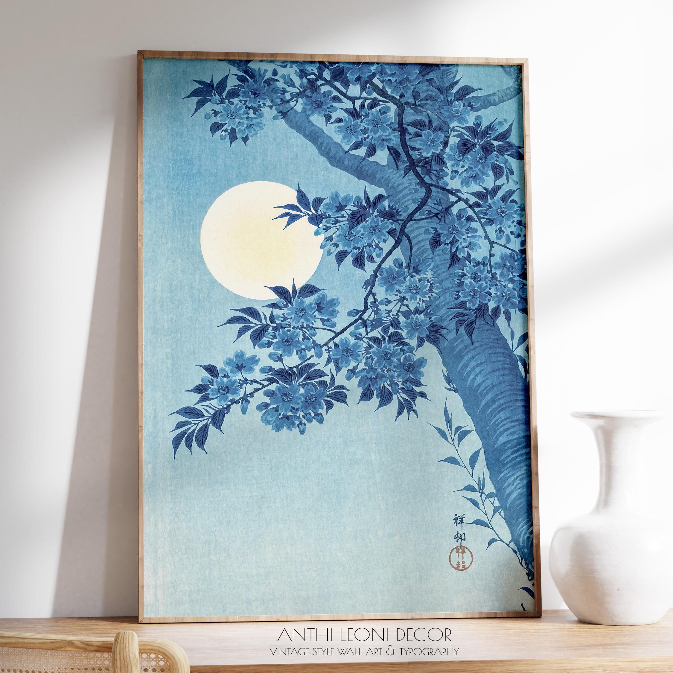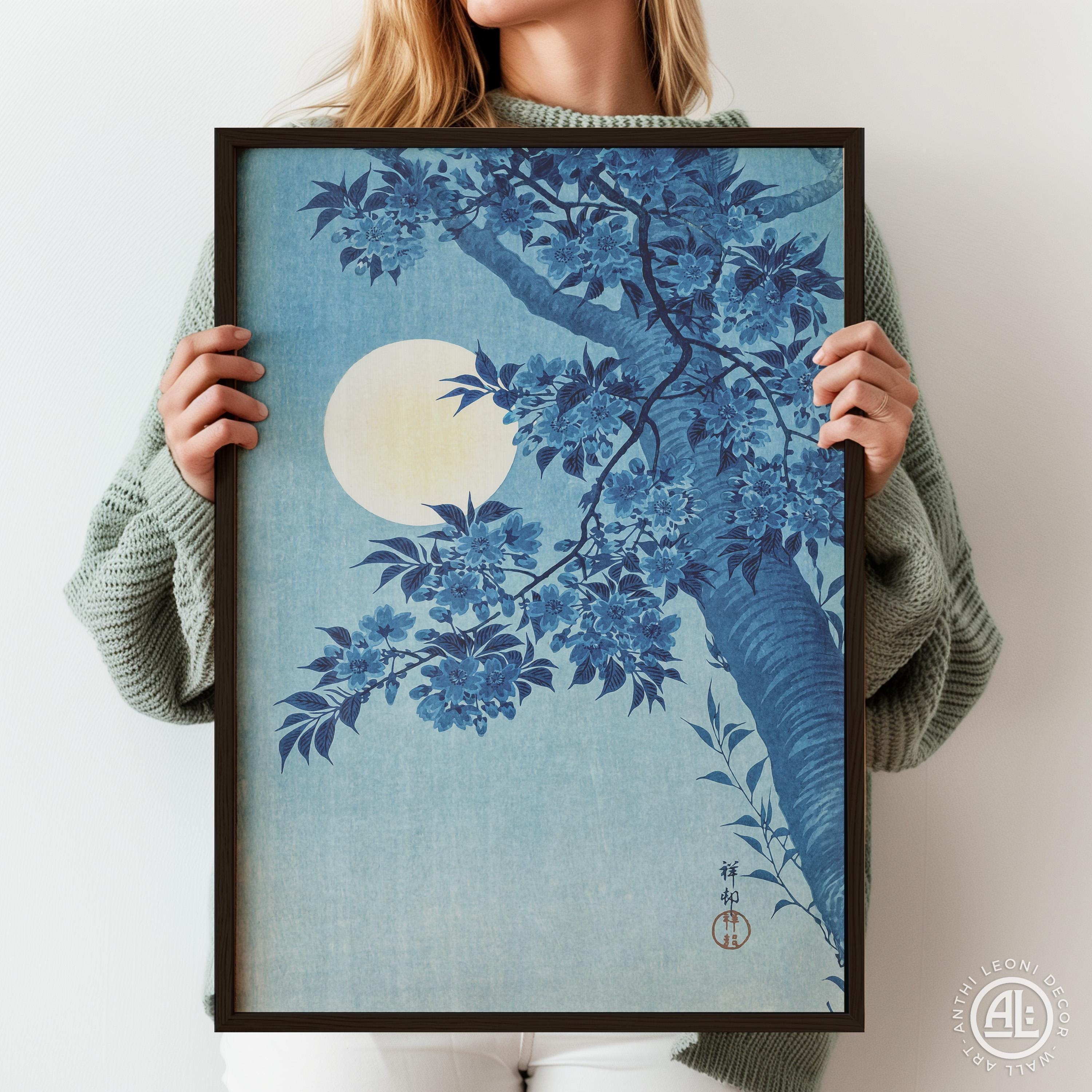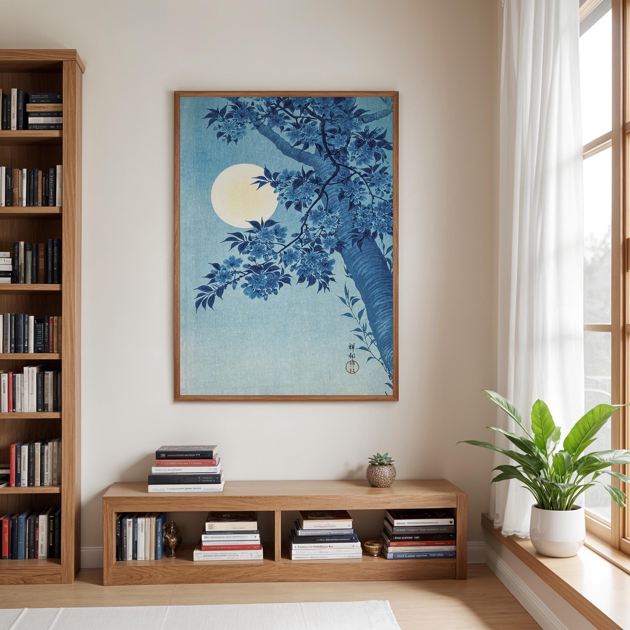 Blue Japandi Wall Art – Cherry Blossom & Moon Print, Ohara Koson Remastered Poster, Minimalist Japanese Wall Decor, Framed or Unframed