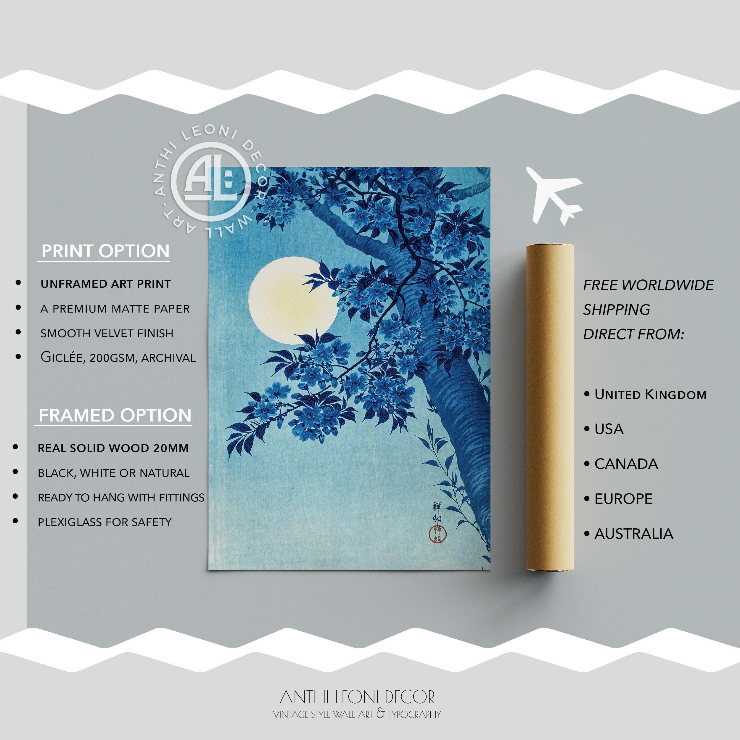 Moonlight & Blossom in Blue - Japandi Cherry Tree Wall Art - Ohara Koson Inspired Wall Art - Framed or Unframed Gift or Interior Decor