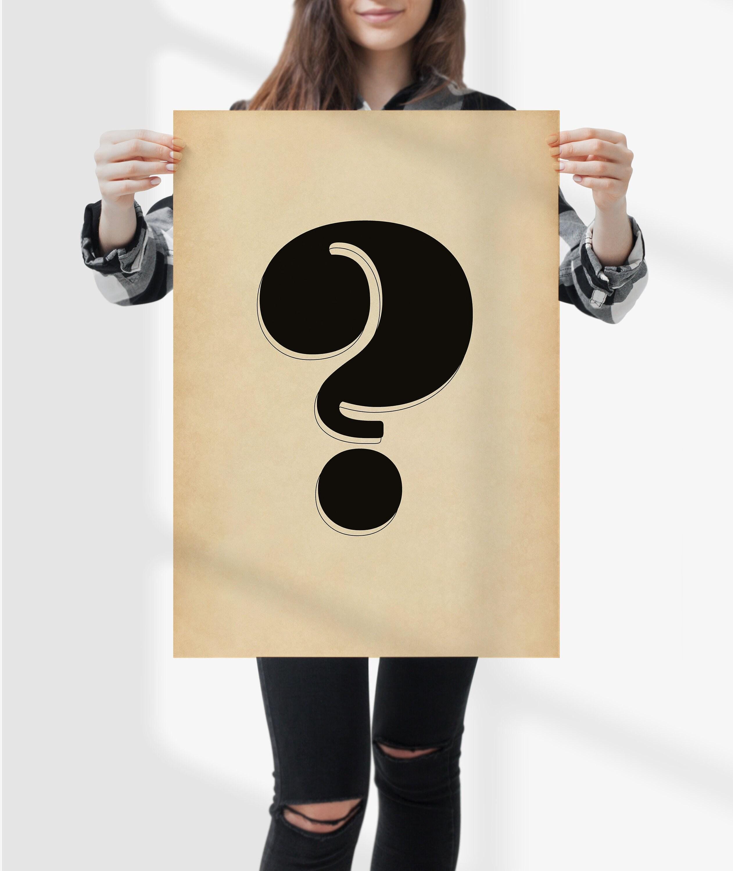 Question Mark print for office, studio and gallery walls—vintage punctuation typography poster in minimalist black on a softly aged, parchment-style background; available as ready-to-hang framed prints or as unframed prints to style your way.