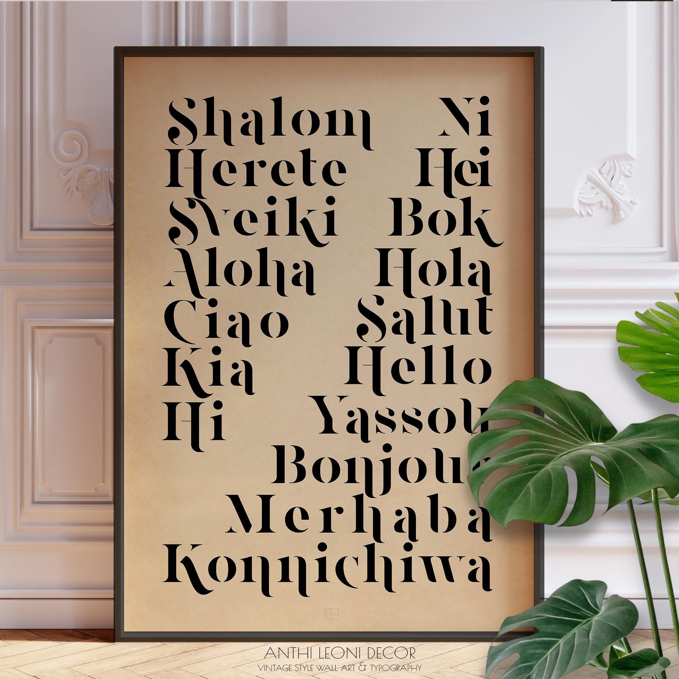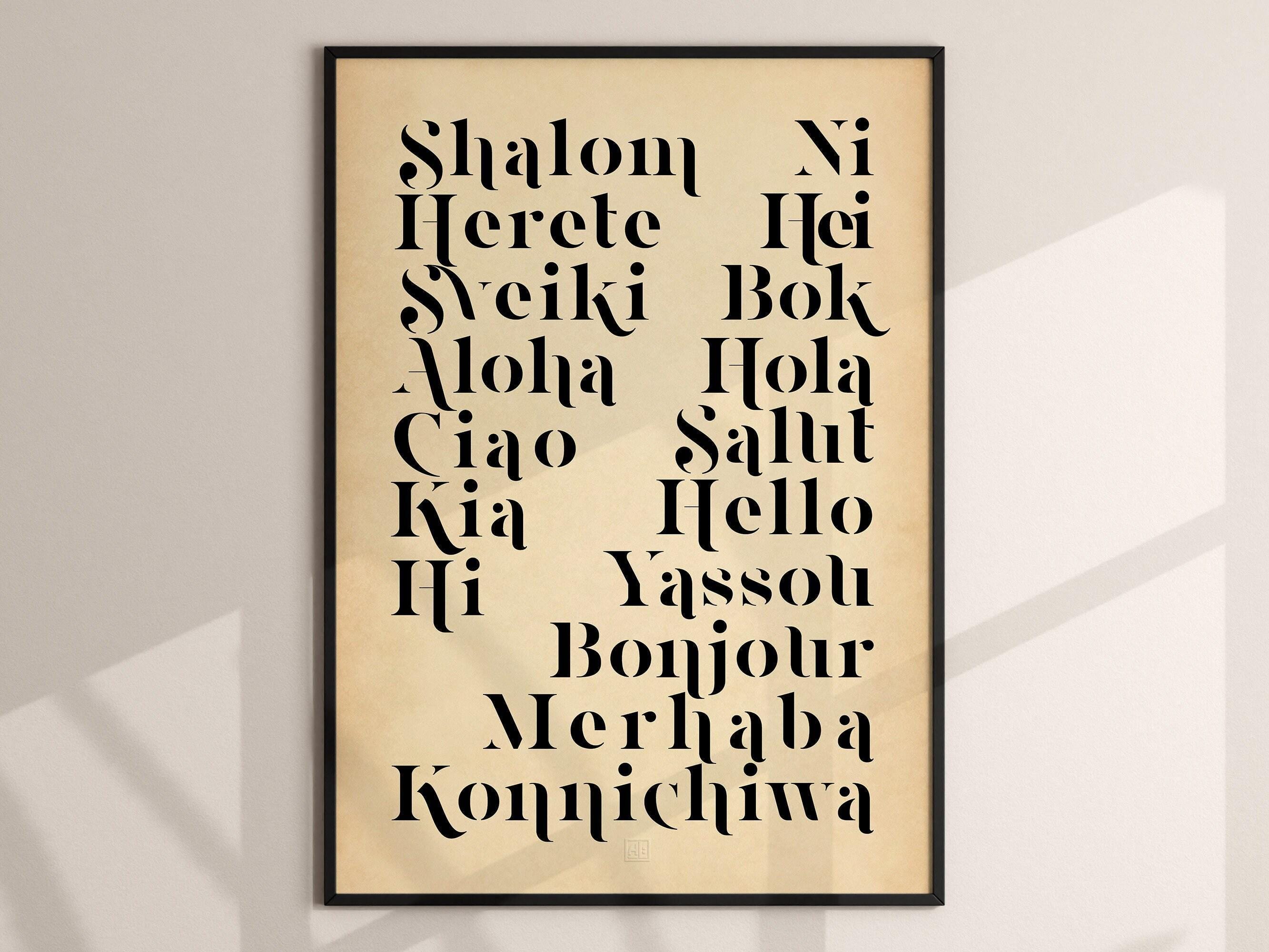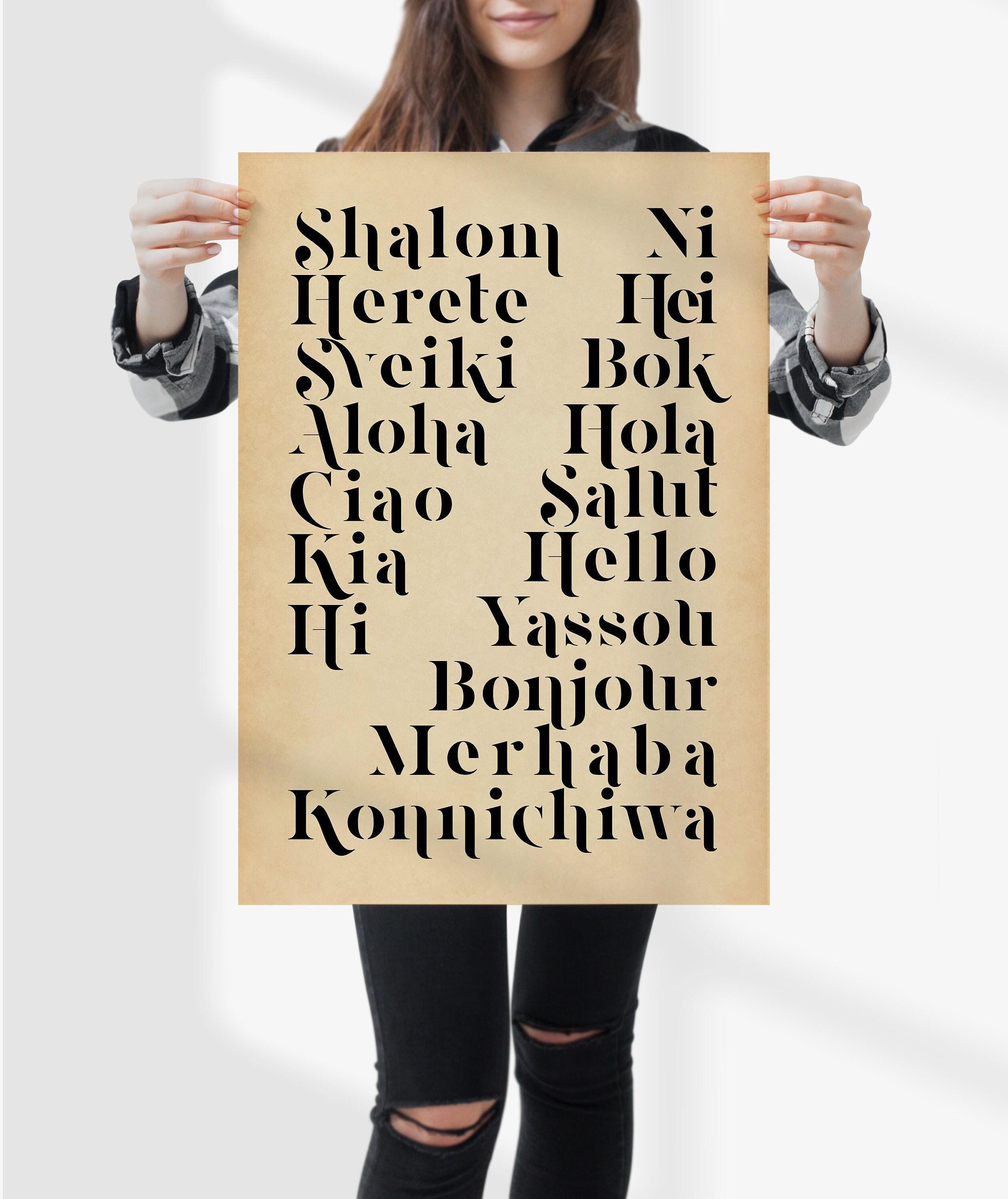 Hello in Different Languages print for entryways, offices and classrooms—vintage typography poster of world greetings, available as ready-to-hang framed prints or as unframed prints to style your way.