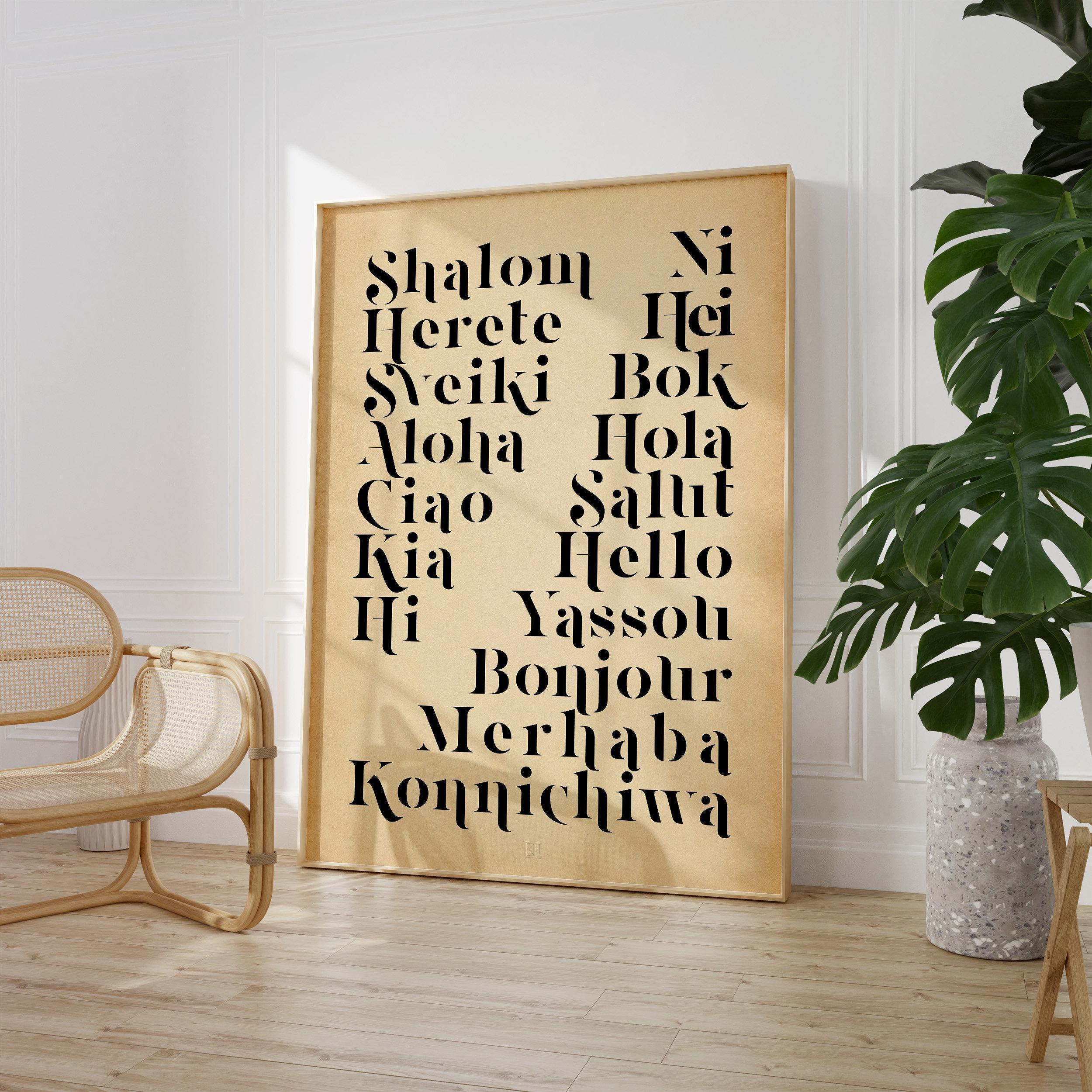 Welcome friends from near and far with a charming collage of “hello” set in classic, vintage-style typography on a softly aged, parchment-style background. The neutral tones and balanced layout suit bookish, modern classic and Scandi interiors, making it a lovely statement for a hallway, foyer, home office, studio or classroom. A thoughtful gift for teachers, linguists and travellers, this multilingual wall art layers beautifully into gallery walls and adds a friendly, cosmopolitan touch to any room.