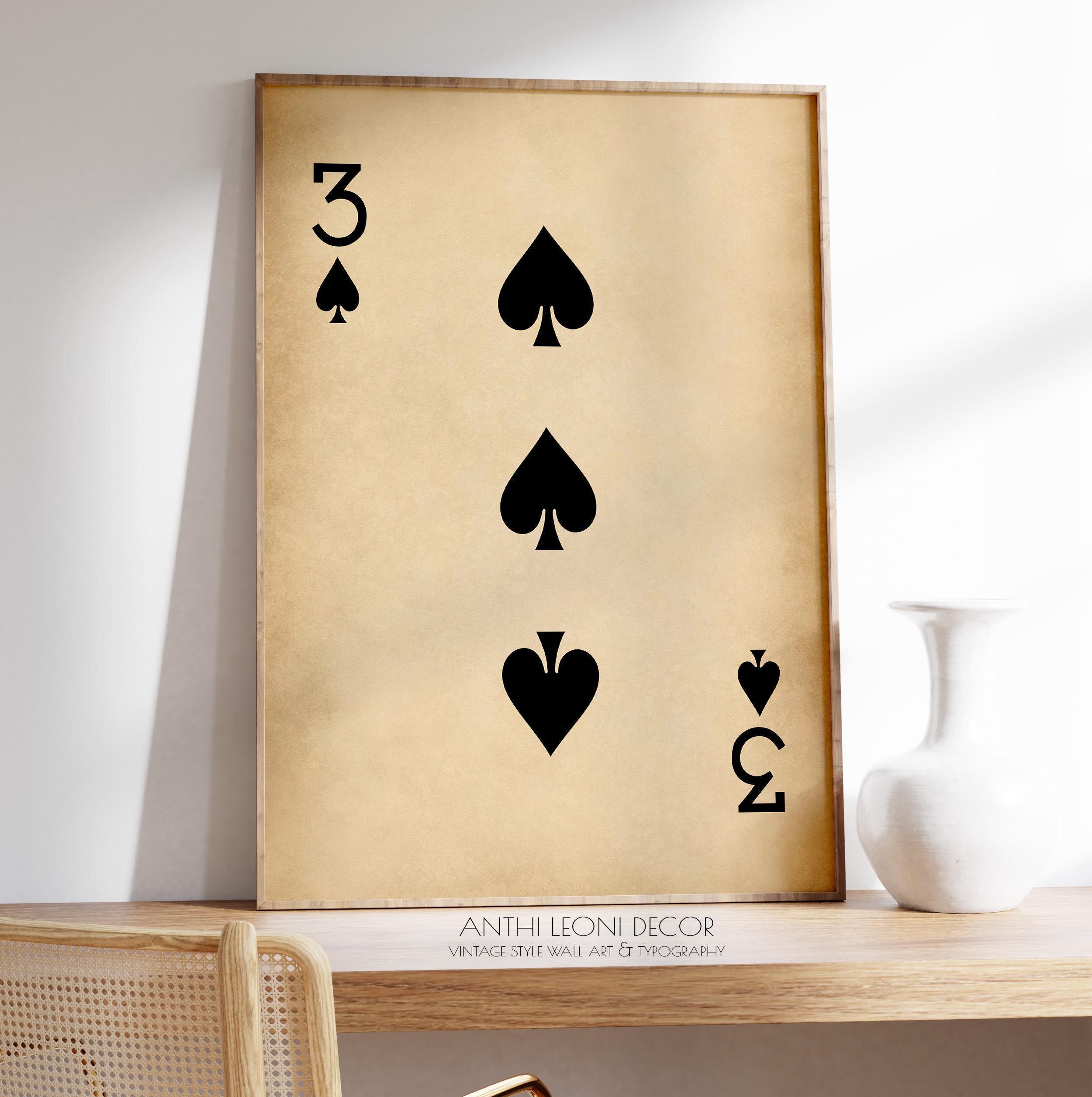 Enhance the ambiance of your living space with this exquisite antique rustic style Three of Spades wall art playing card poster print. Featuring an aged rustic aesthetic, this piece is perfect for adding a touch of sophistication to your living room, bedroom, entryway, or games room decor. It also makes for a unique and thoughtful gift idea for any poker or card enthusiast. Elevate your space with this timeless and elegant aged lucky number 3 card art print.