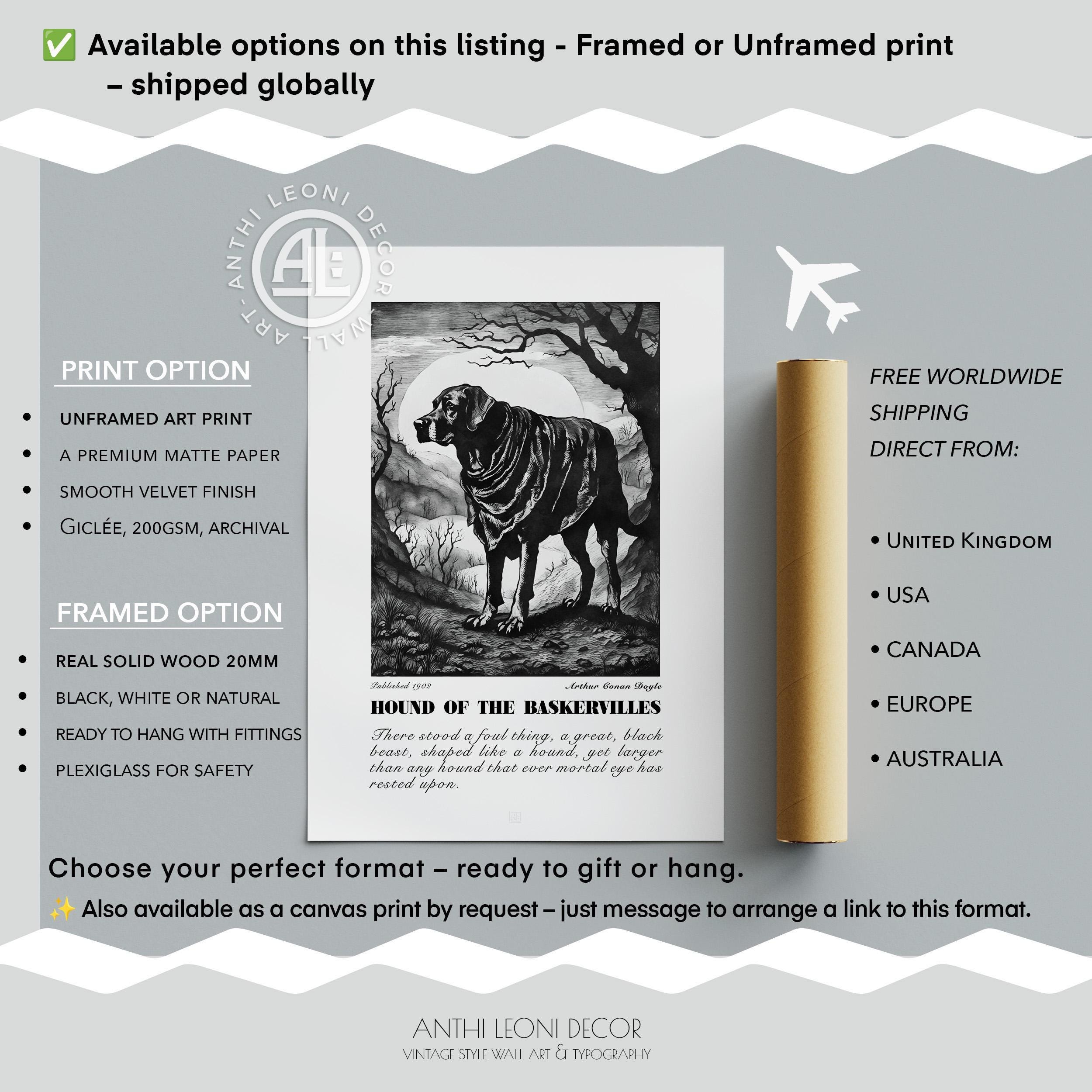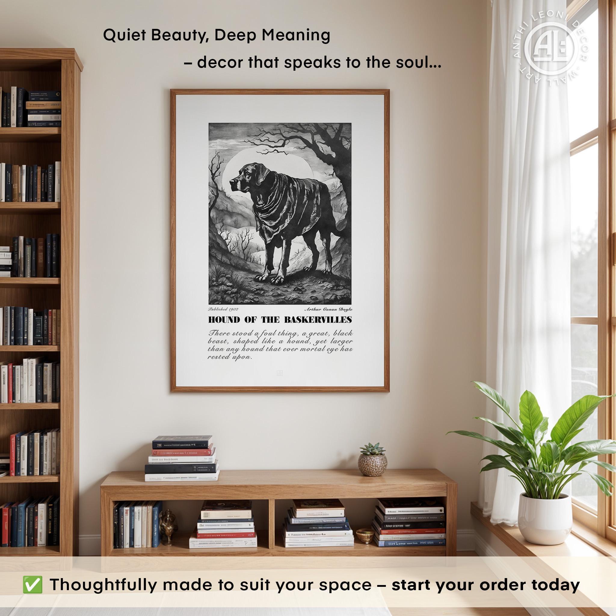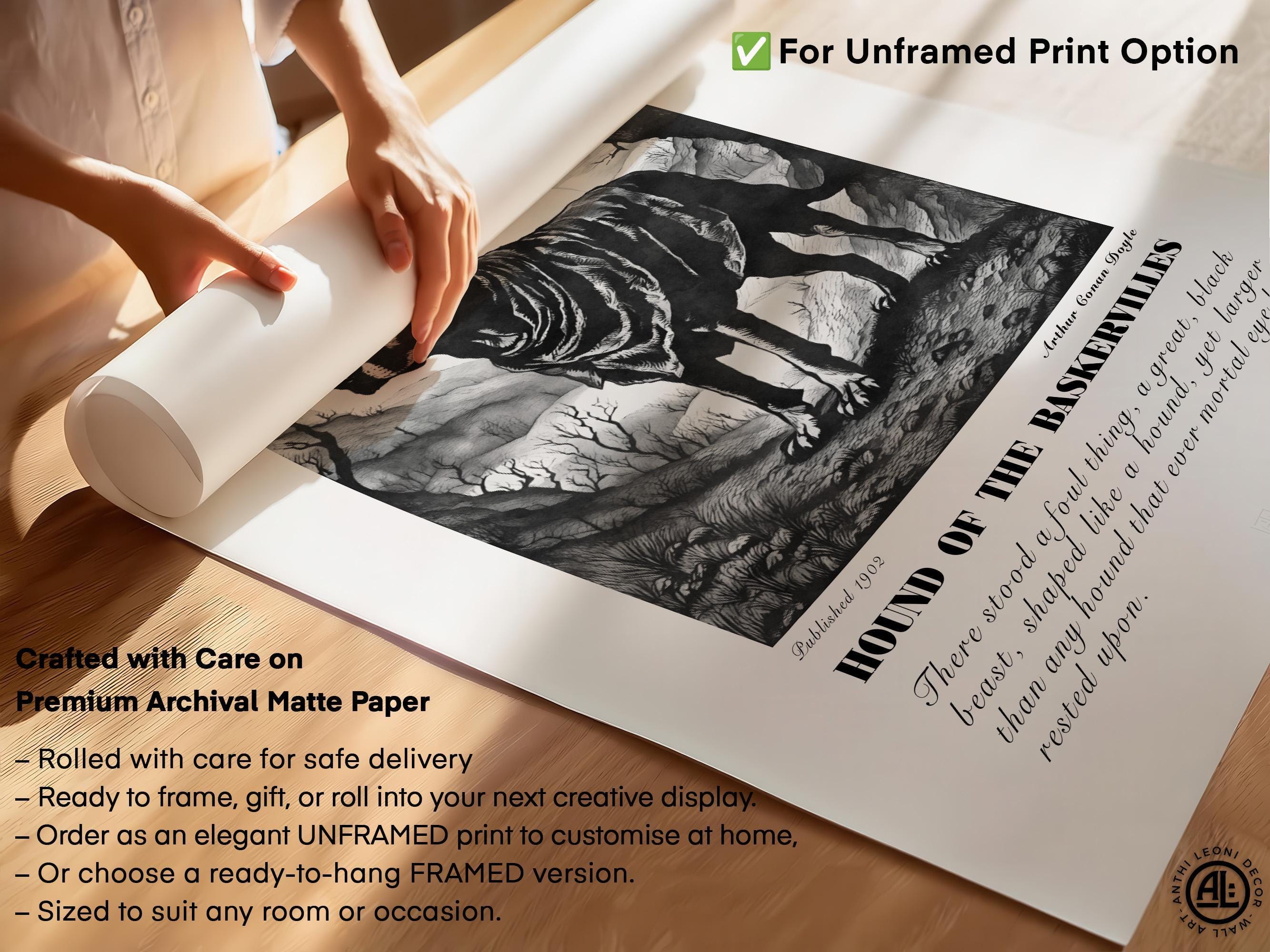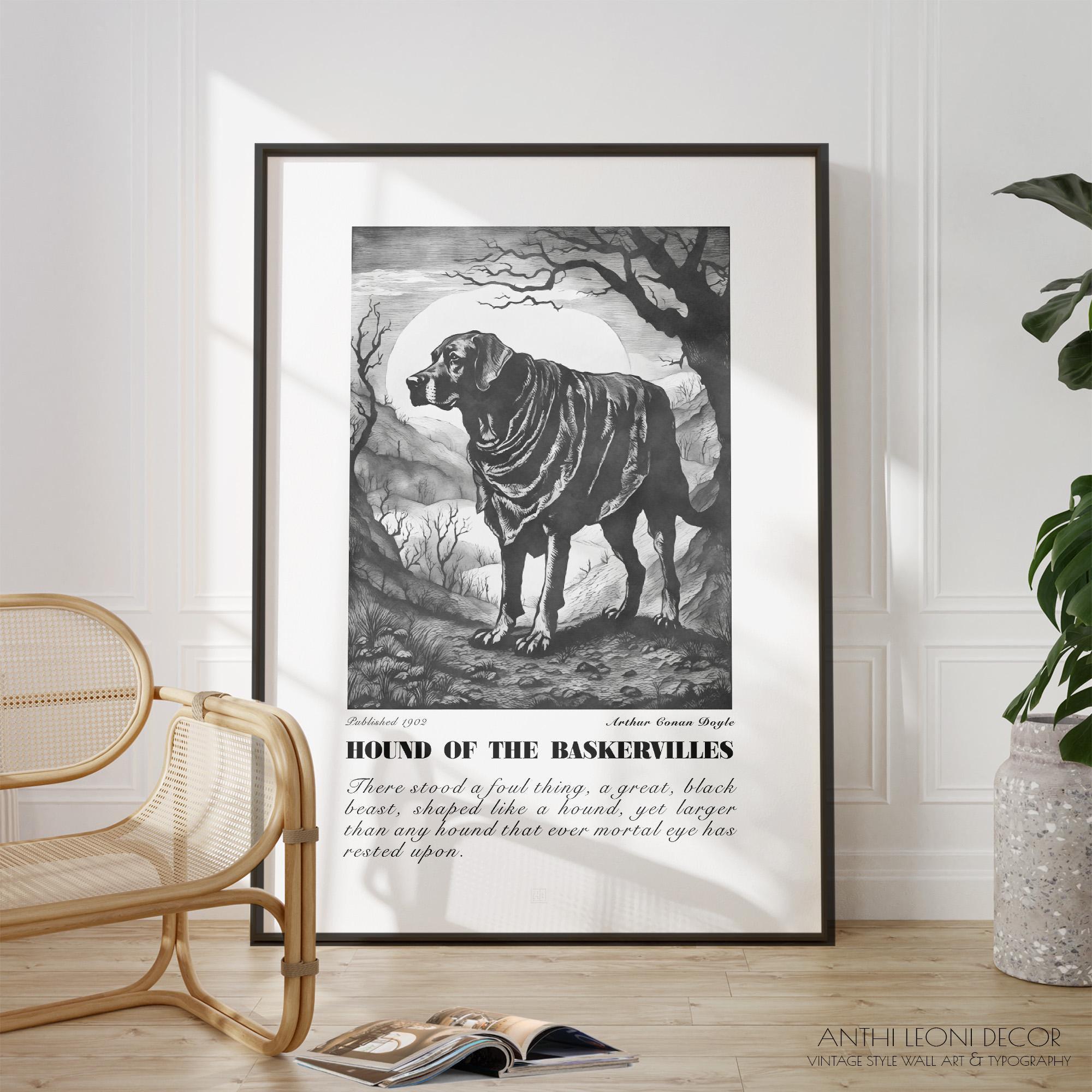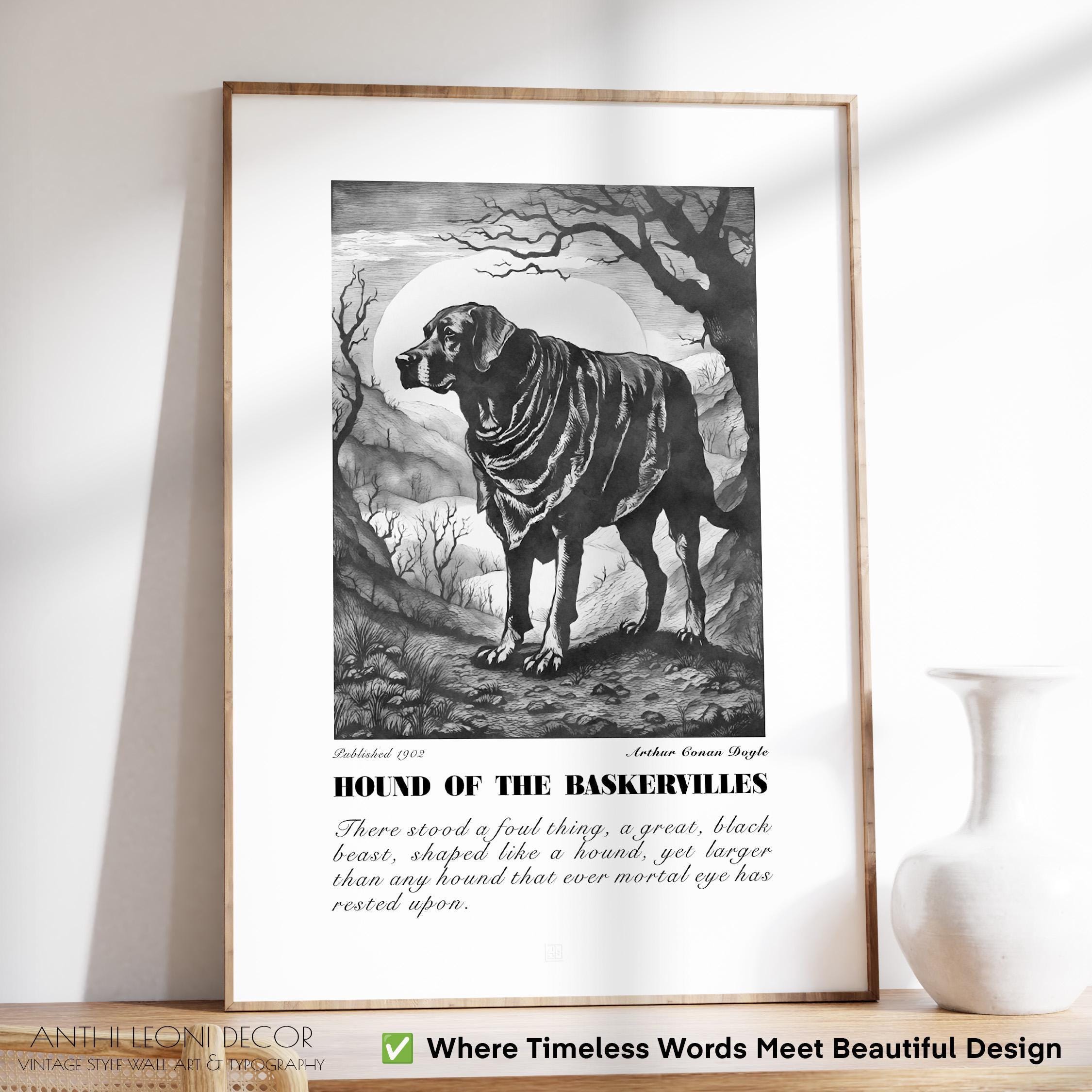 Elevate your living space with the captivating print of our black and white book illustration inspired by Sir Arthur Conan Doyle's timeless masterpiece, "The Hound of the Baskervilles." This enchanting piece features the powerful hound dominating a dark and dramatic landscape under a moonlit sky, accompanied by a popular excerpt from the novel There stood a foul thing, a great, black beast, shaped like a hound, yet larger than any hound that ever mortal eye has rested upon. Immerse yourself in the world of this classic story, beautifully portrayed in this artful greyscale book page representation. Add a touch of sophistication and literary charm to your home decor by including this exquisite print in your bookish collection.