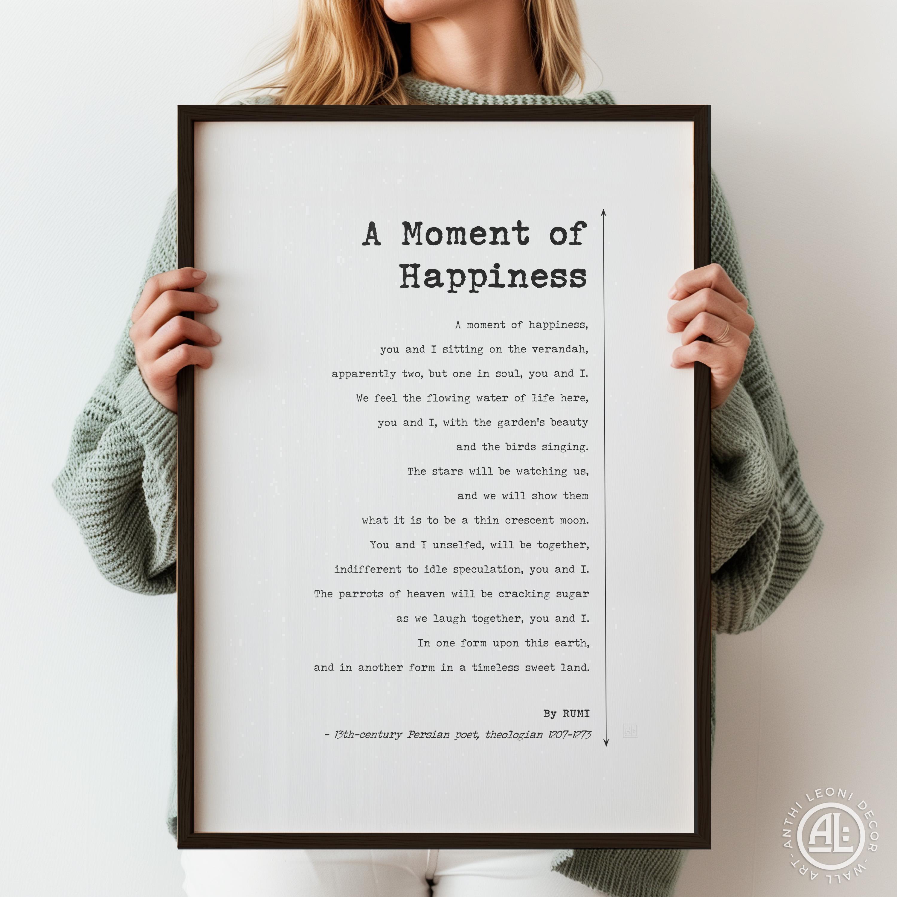 Discover the timeless beauty of love with our stunning "A Moment of Happiness" Rumi poem print — a perfect addition to your romantic home decor. Crafted with love and inspired by the legendary poet Rumi, this typography artwork captures the fleeting yet profound essence of happiness in love, making it an ideal gift for anniversaries, weddings, or special moments with your soulmate.