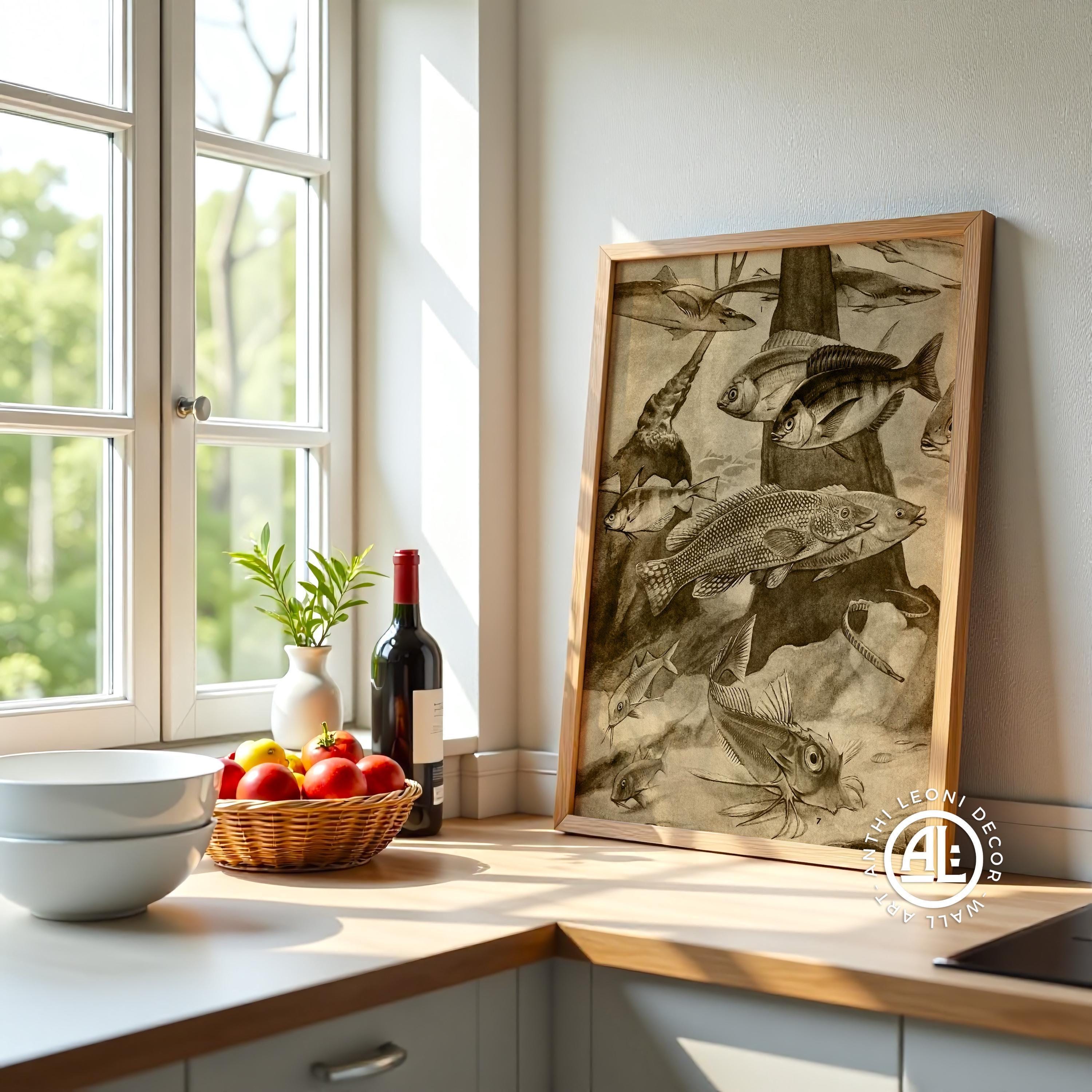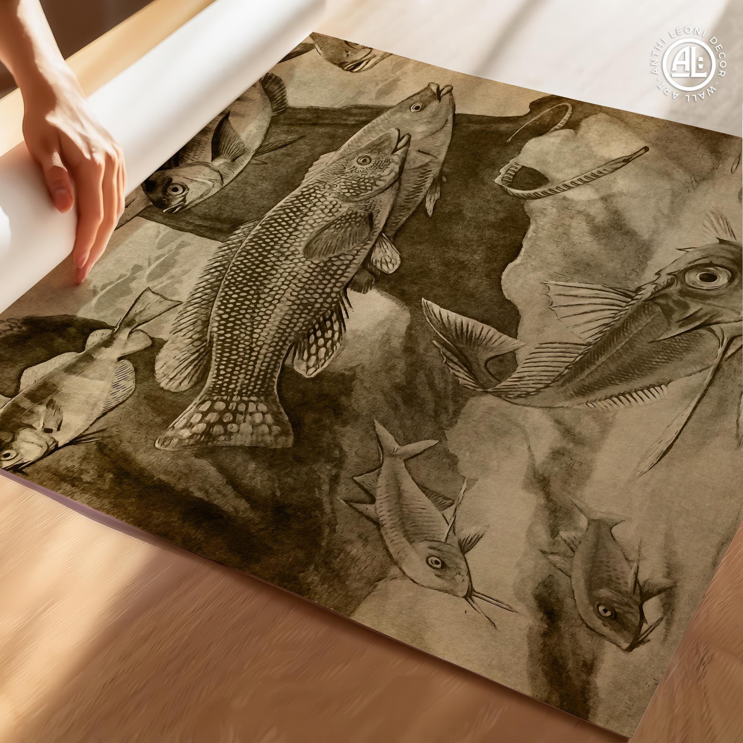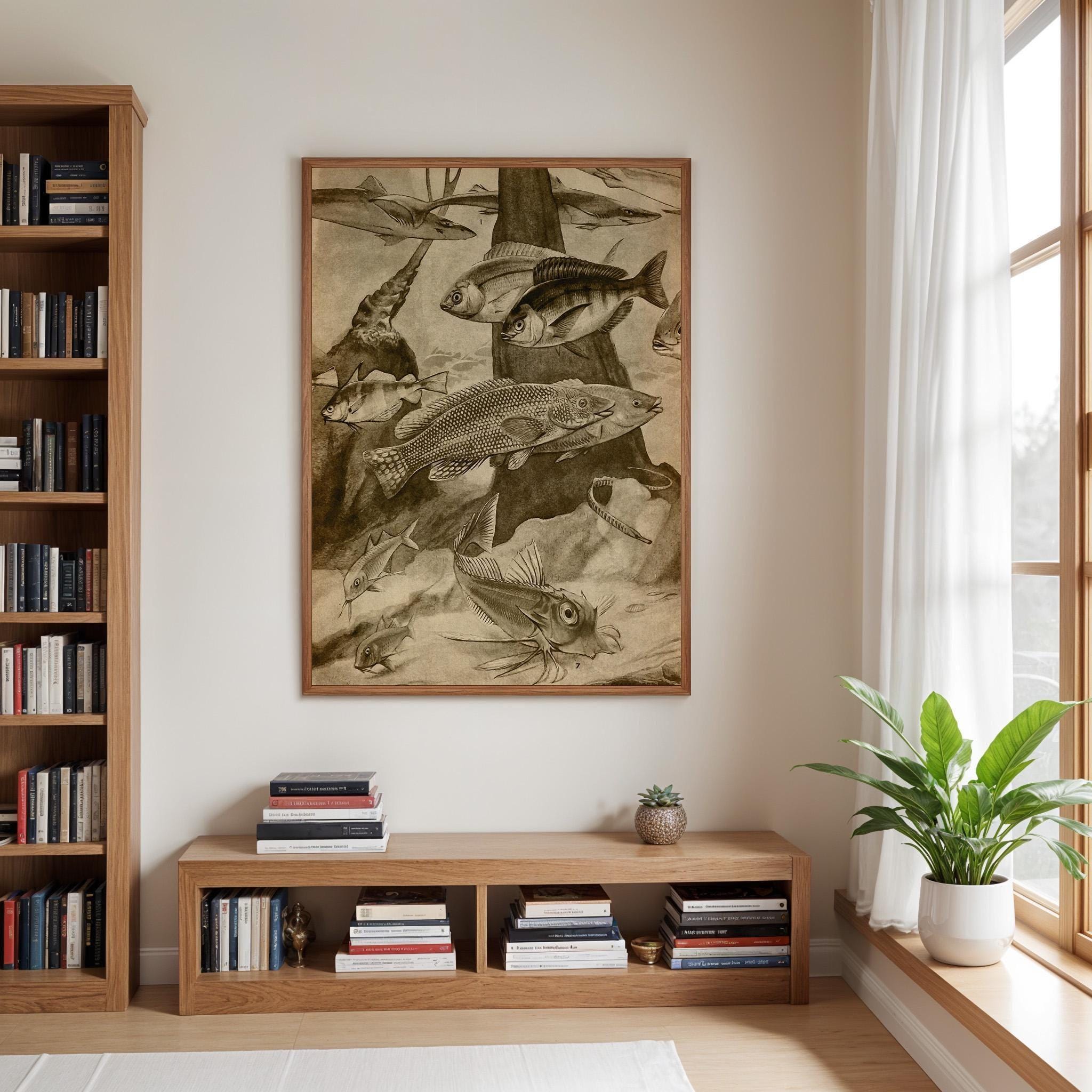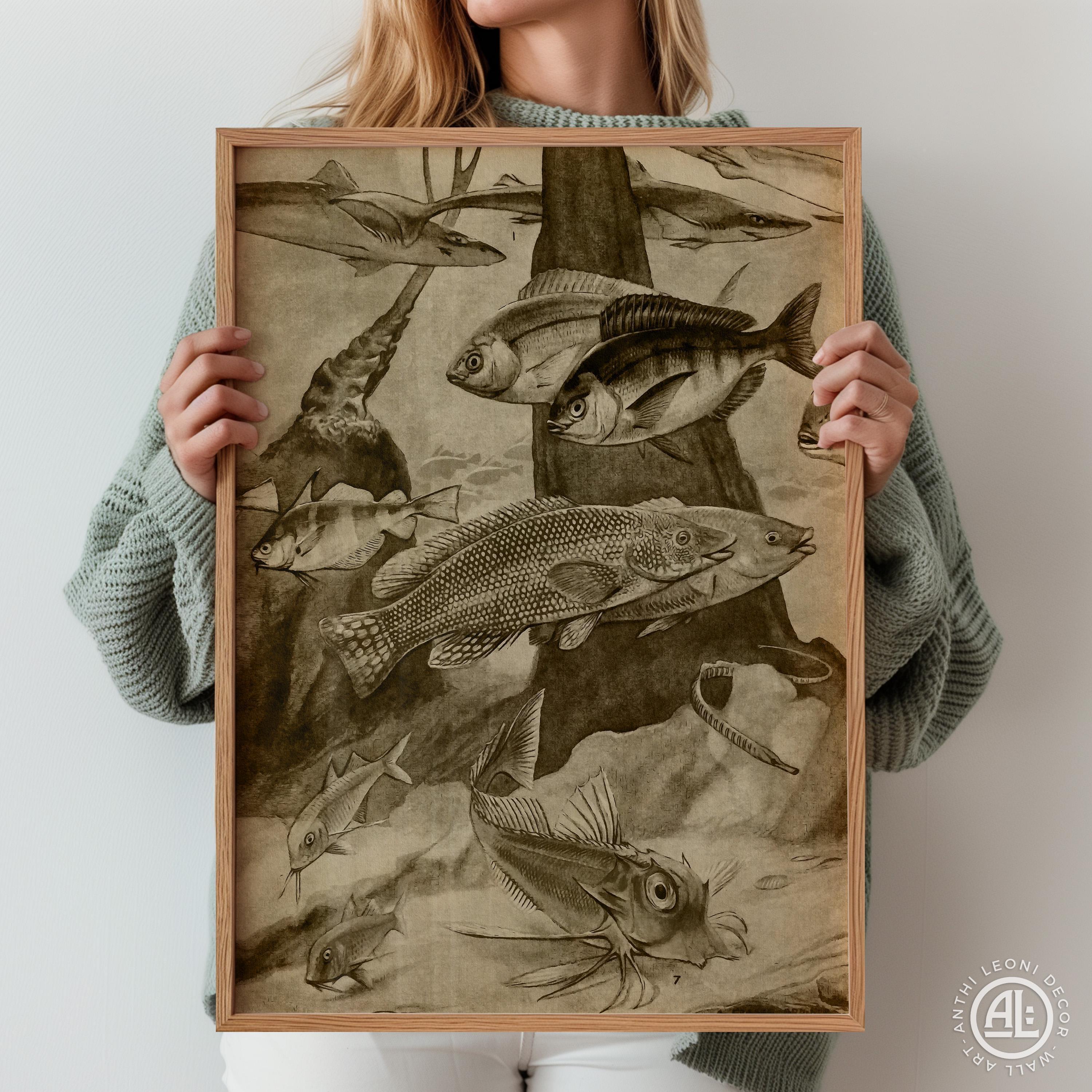 Vintage Sepia Fish Print: British Offshore Marine Life, Coastal Wall Art