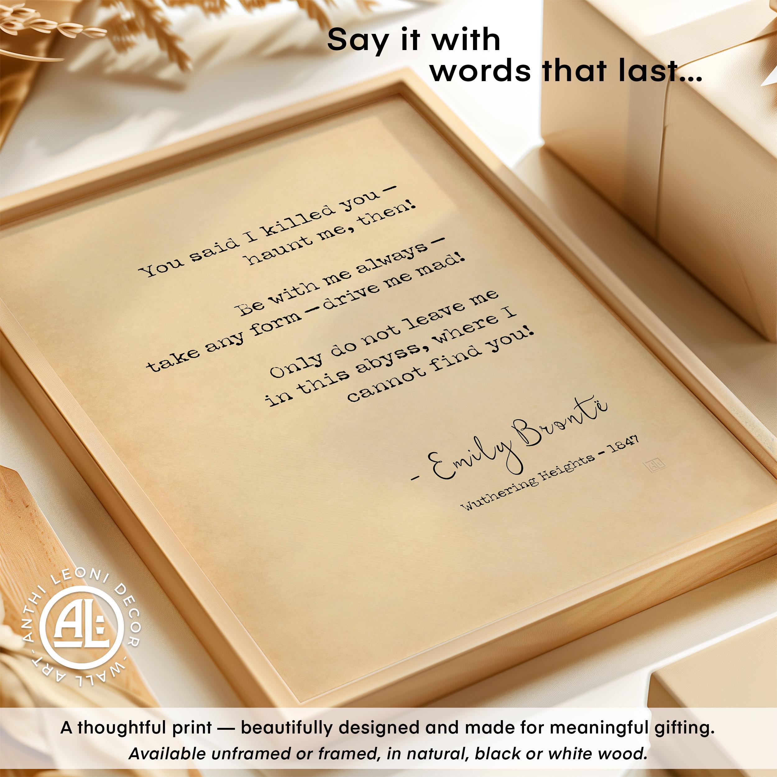 This piece captures one of the most haunting and passionate moments in Wuthering Heights, making it a striking choice for those drawn to classic literature, romantic poetry, and darker, atmospheric interiors. The typography is carefully arranged for balance and clarity, allowing the words to take centre stage without distraction.