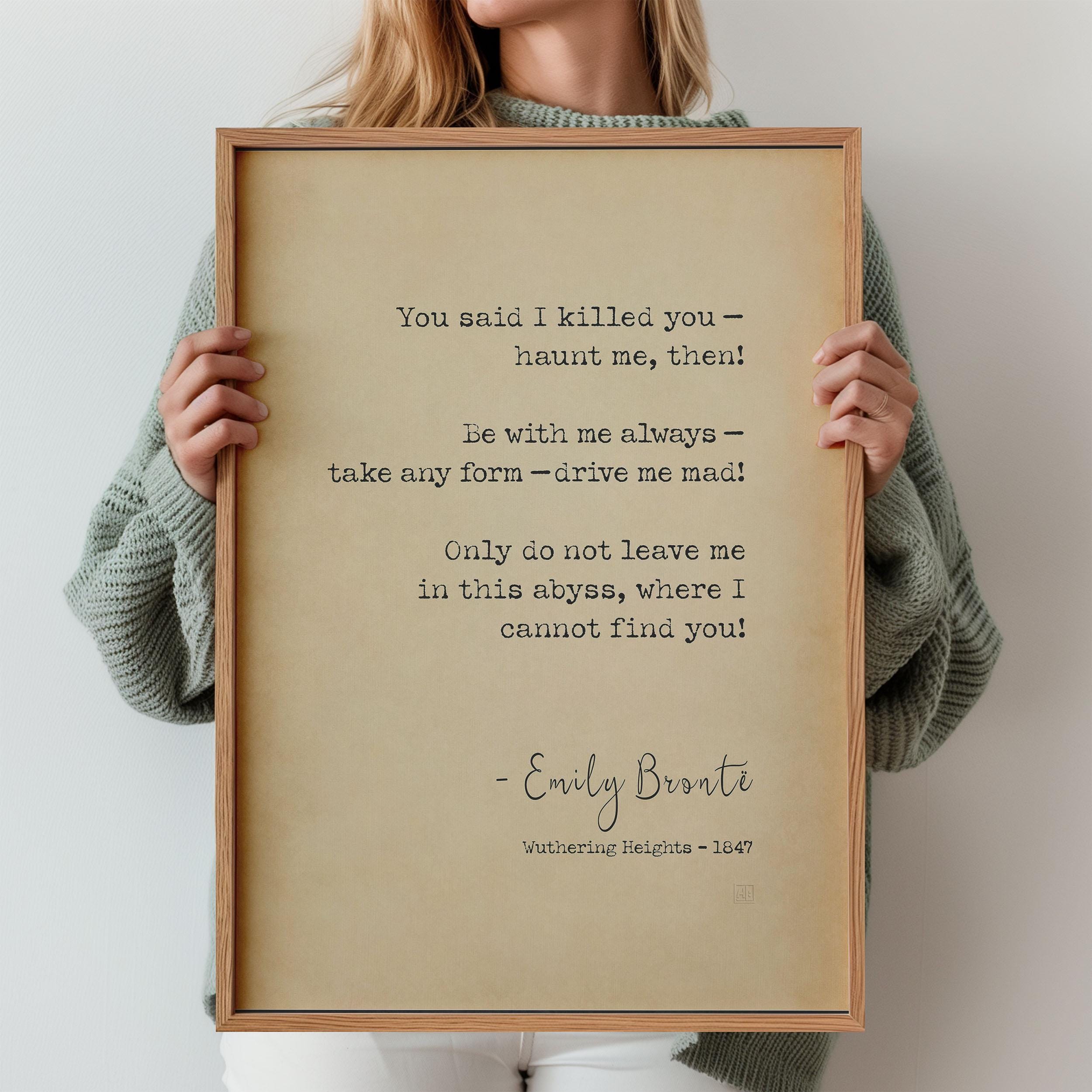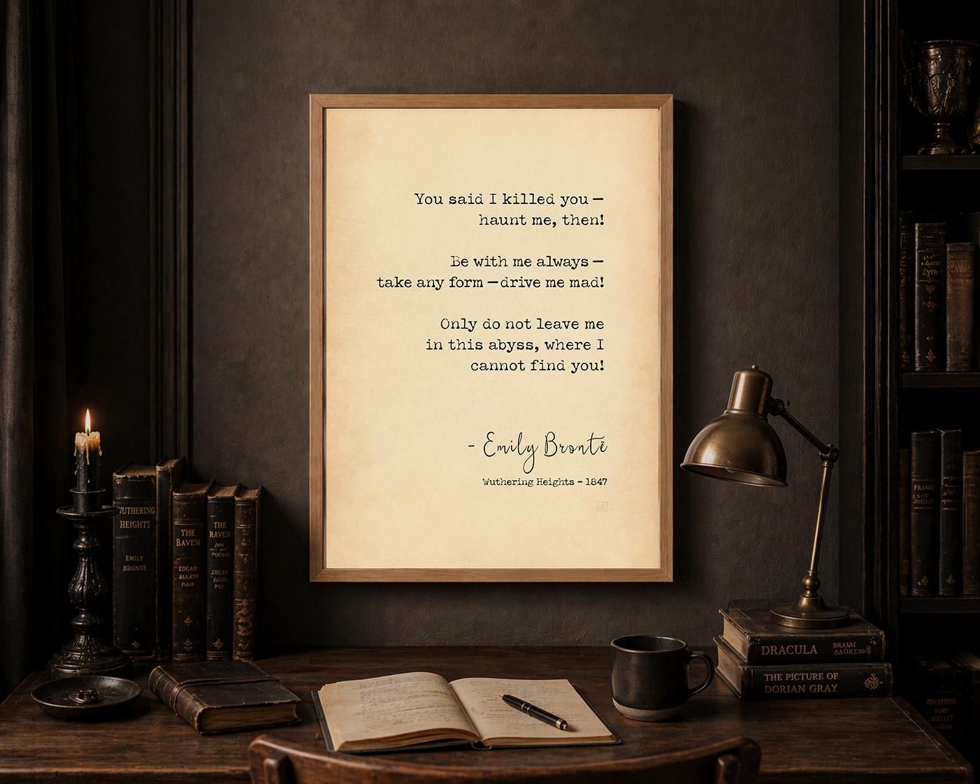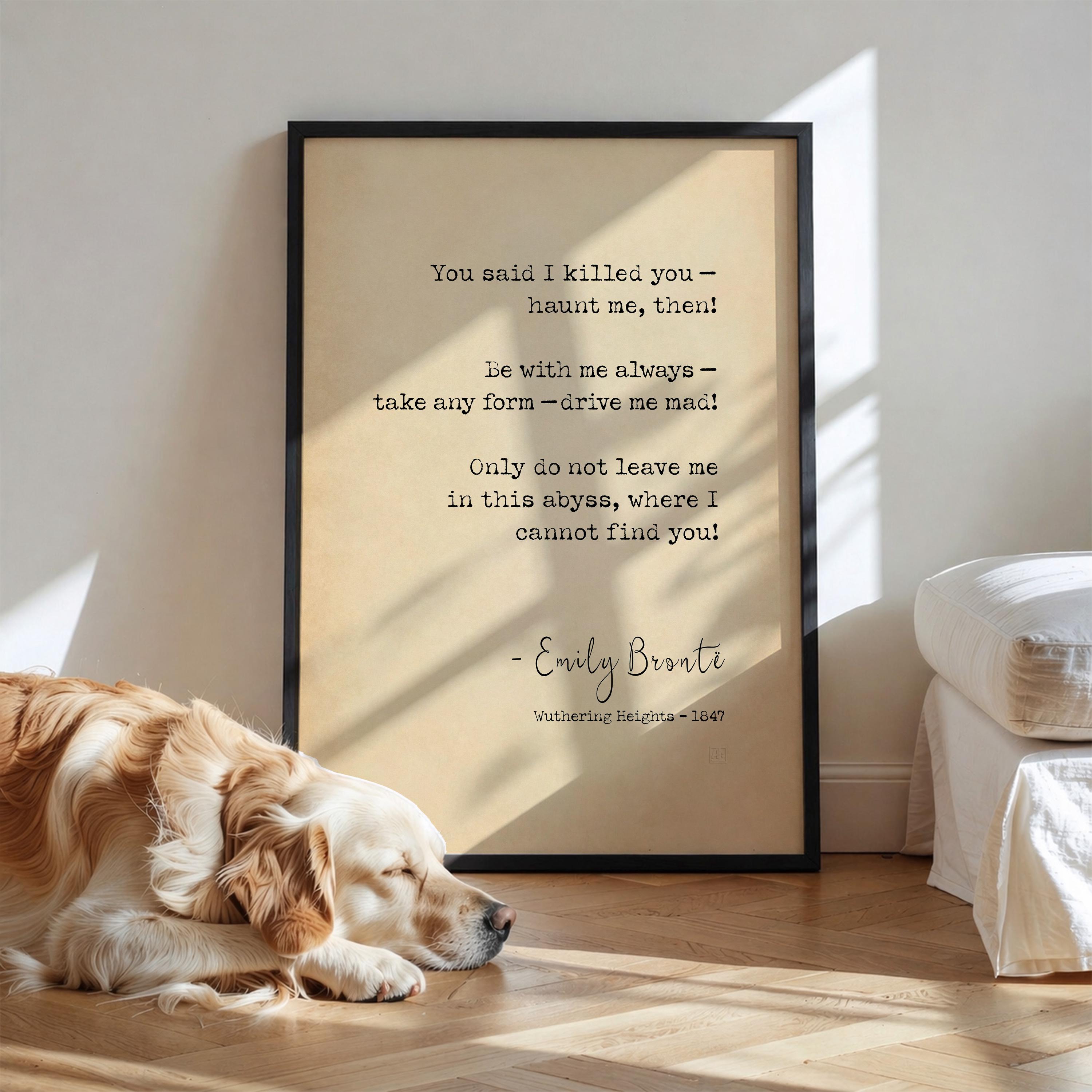Wuthering Heights poster print featuring the powerful Emily Brontë quote “Do not leave me in this abyss,” taken from the classic novel. Designed in a soft vintage style, this literary wall art brings a timeless, emotional depth to your space while maintaining a clean, considered aesthetic.