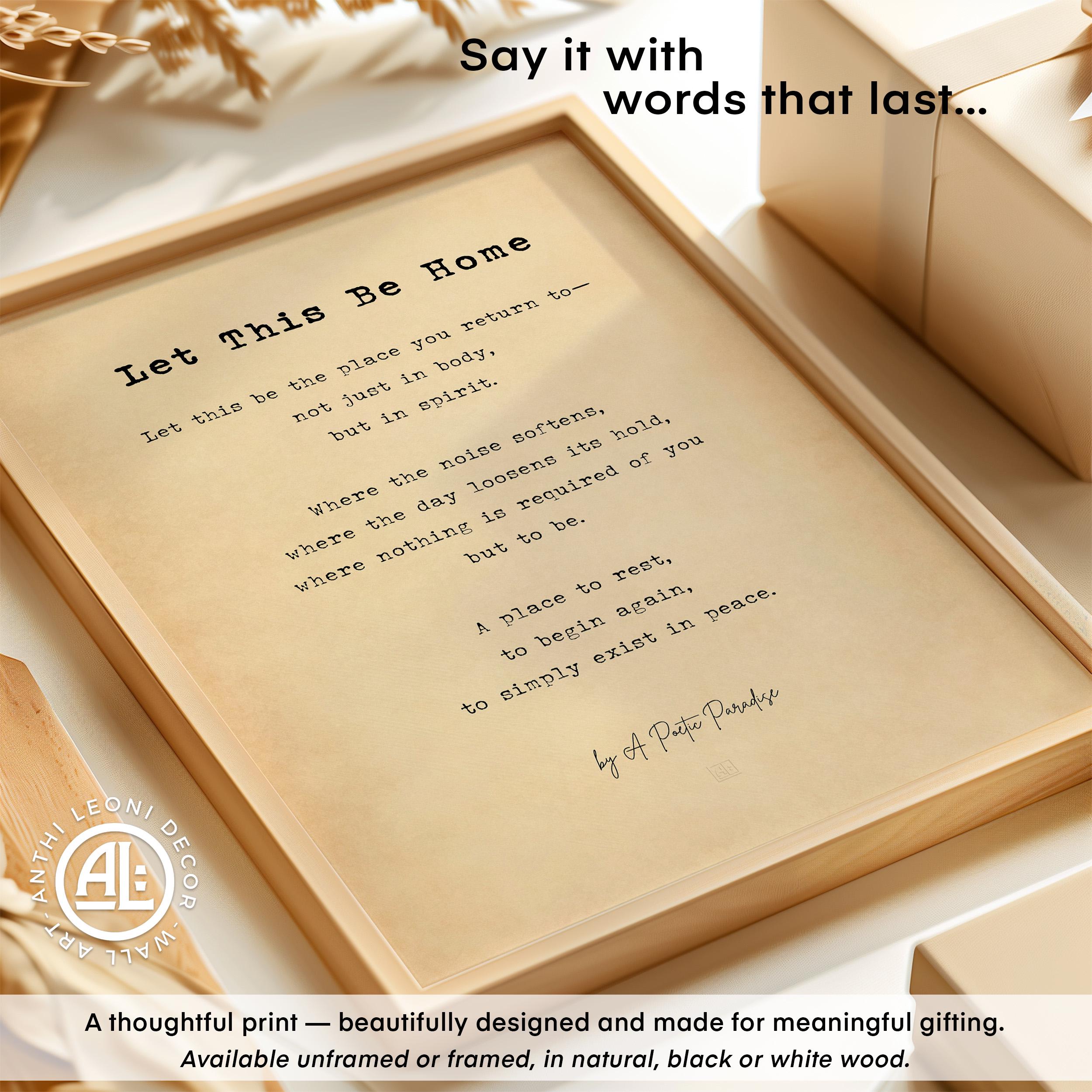 A meaningful home poem poster print designed to bring a sense of calm, comfort, and belonging to the spaces that matter most. “Let This Be Home” is a reflective poetry print created for new homes, housewarmings, and those seeking a quieter, more grounded atmosphere in everyday life.