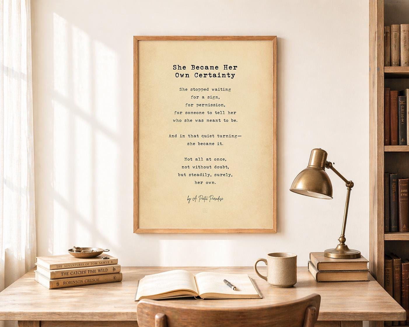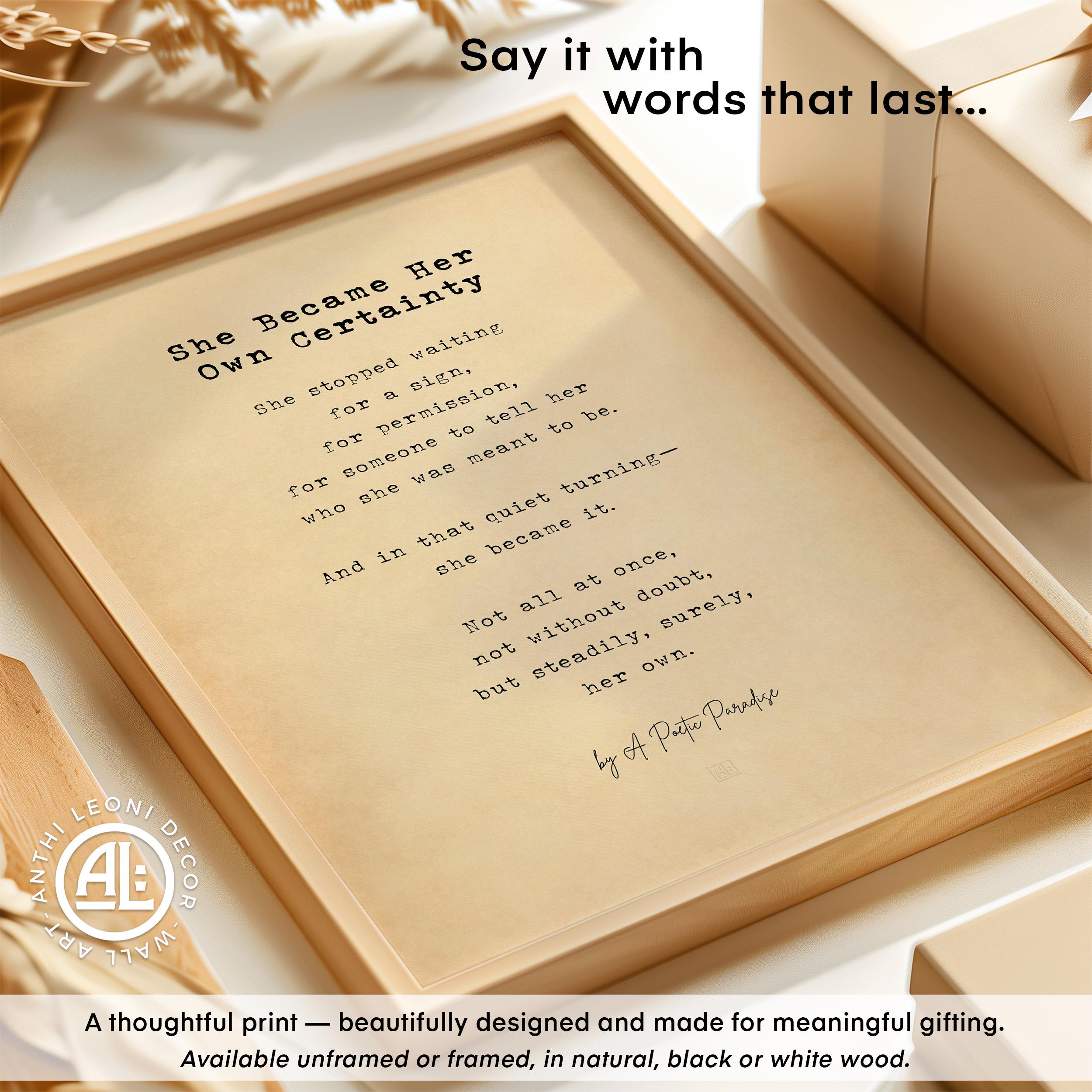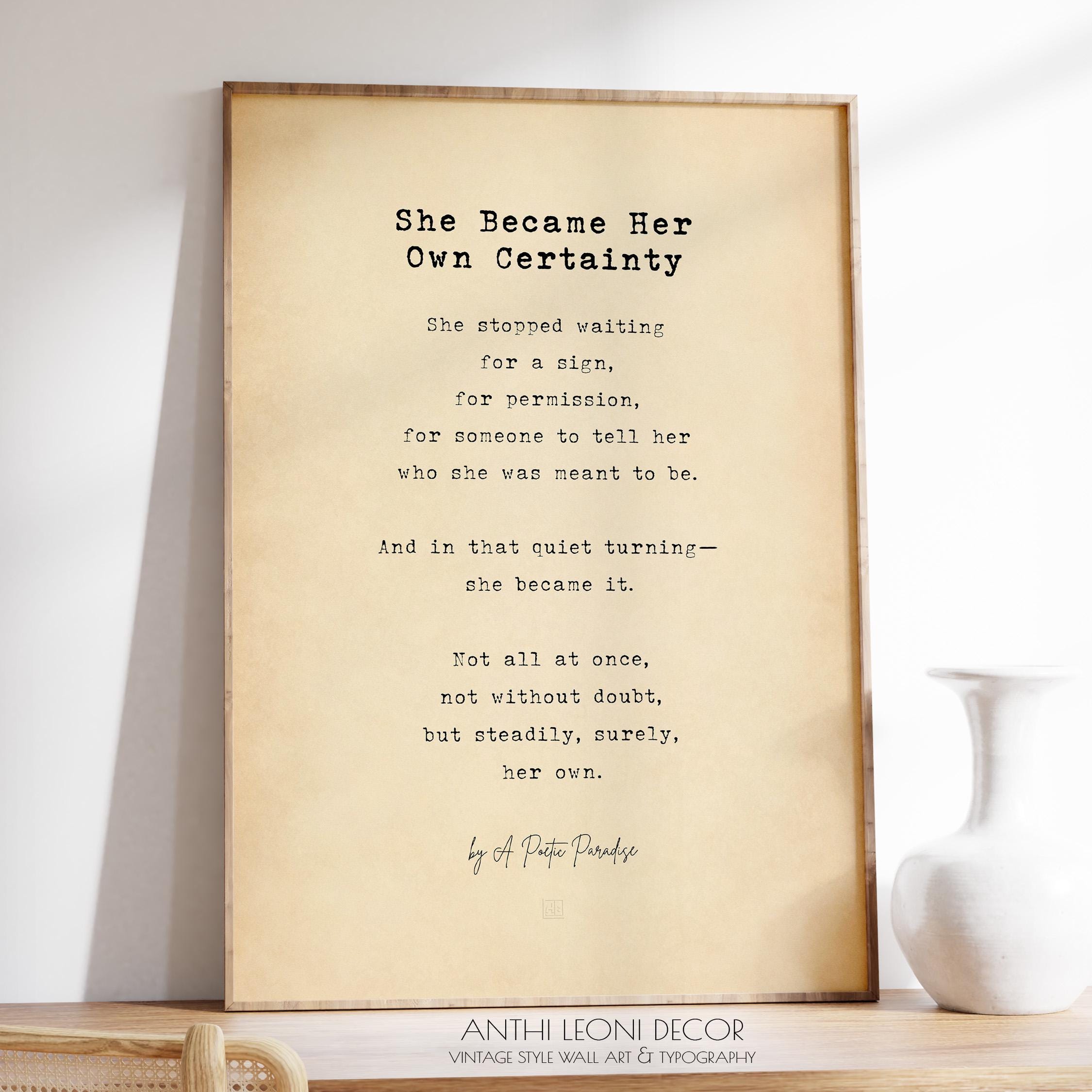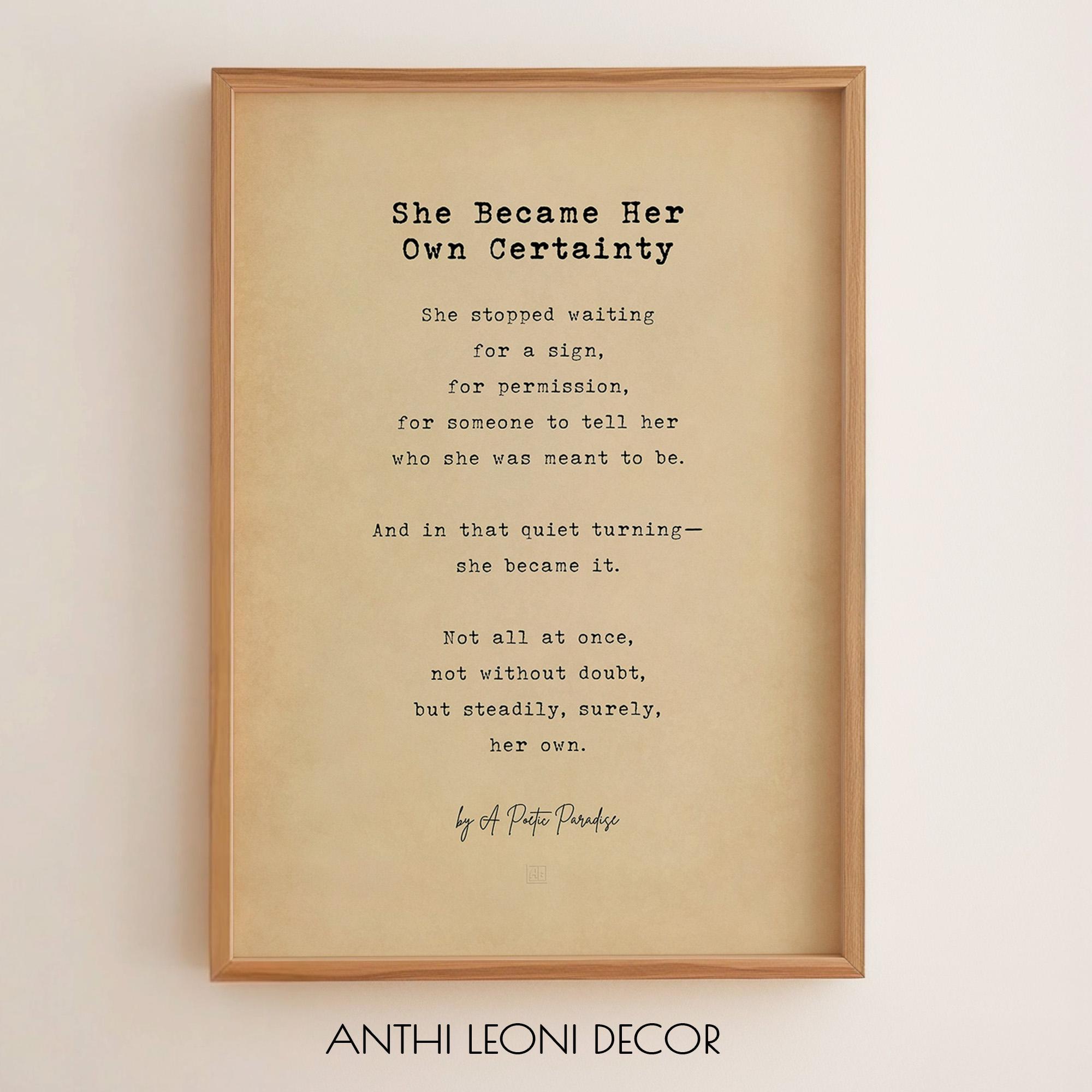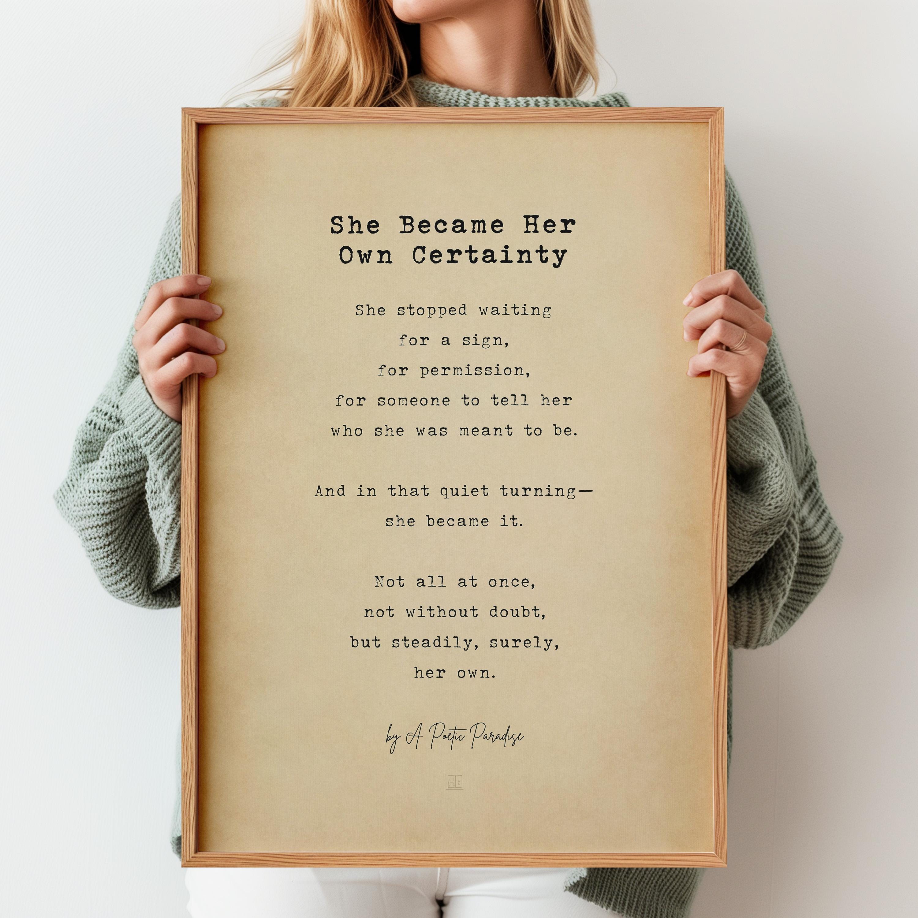 An empowering poetry poster print designed to celebrate independence, growth, and becoming who you were always meant to be. “She Became Her Own Certainty” is a meaningful quote print created for women navigating change, embracing strength, and stepping confidently into their own identity.