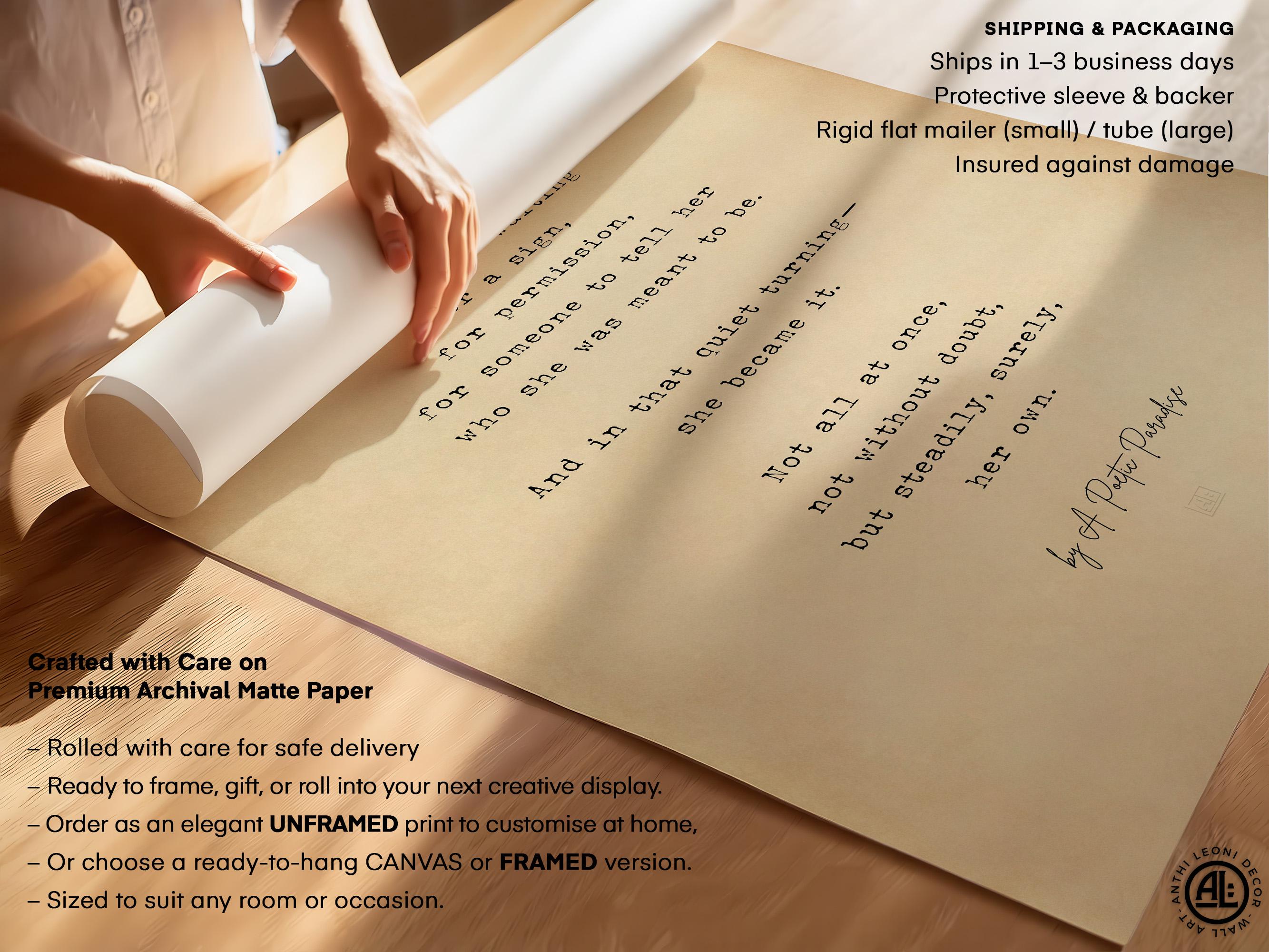 This inspirational poem print captures a quiet but powerful shift—from seeking validation to self-trust. With soft vintage tones and elegant typography, this minimalist poetry wall art print brings a sense of calm strength and clarity to any bedroom, workspace, or personal corner of the home.