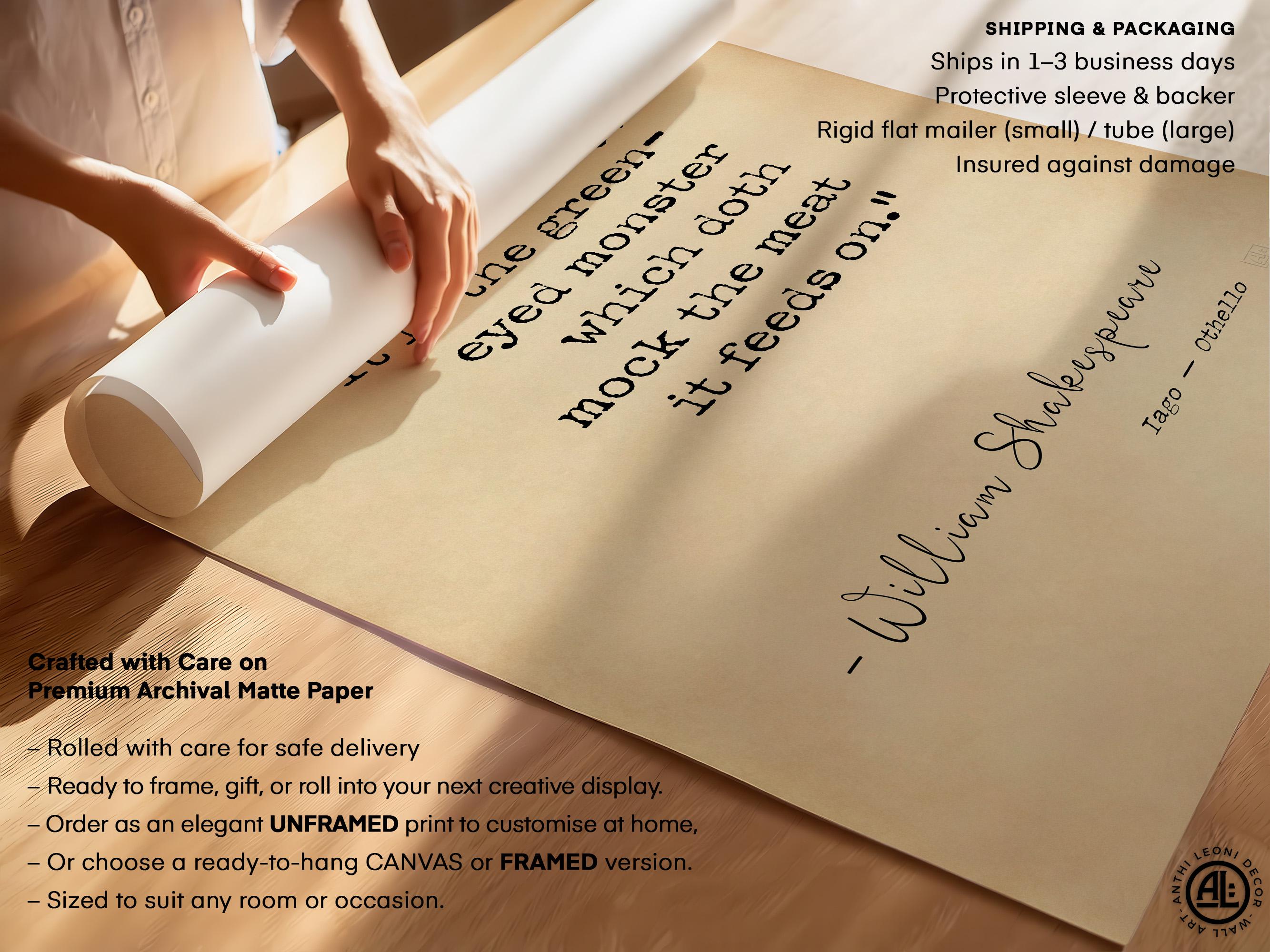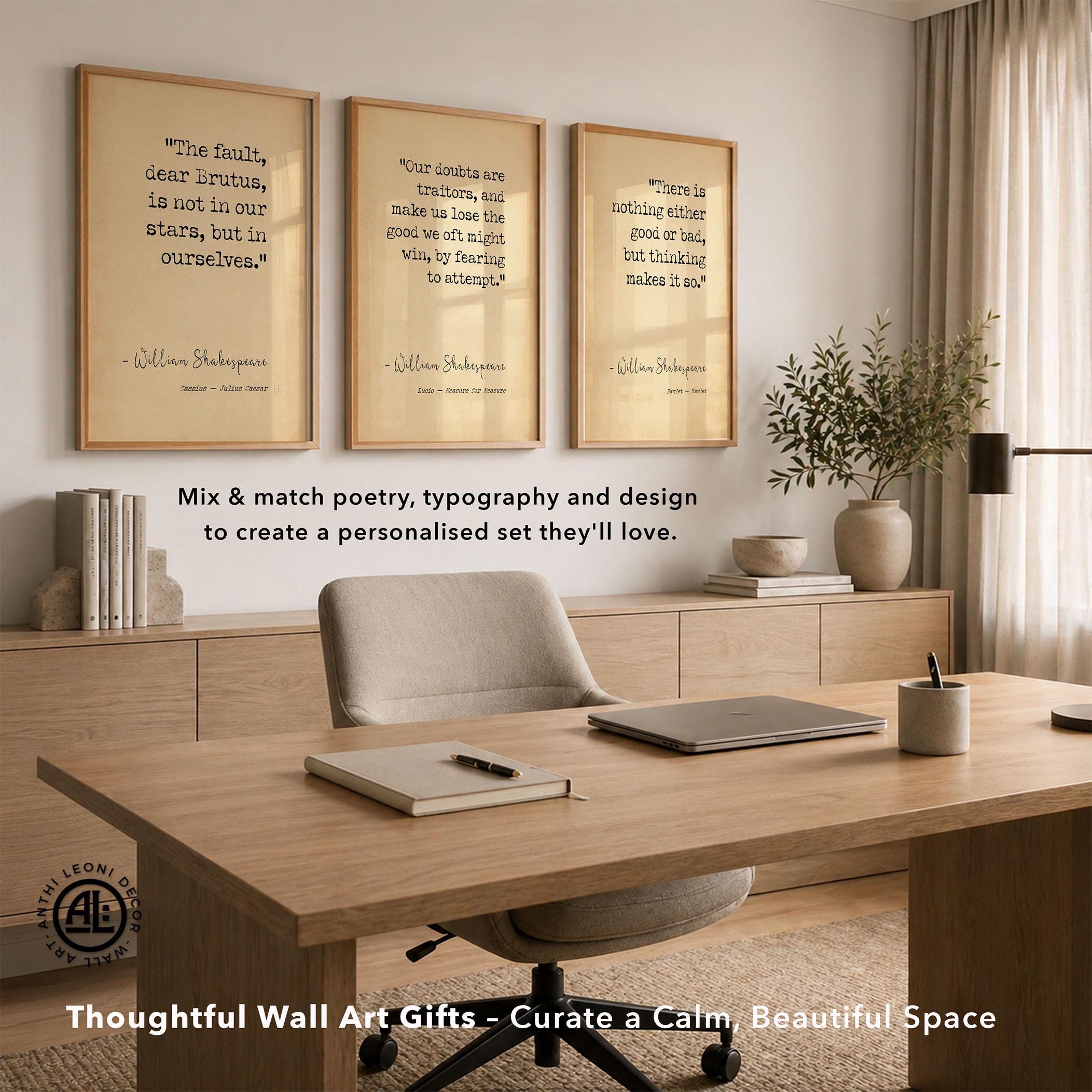 Designed with a strong typographic layout and balanced line structure, this piece reads clearly at a glance while retaining the weight and authority of Shakespeare’s original language. The composition has been carefully considered to ensure it holds visual presence both up close and at a distance, making it ideal for statement wall art in offices, studies, libraries, or minimalist interiors.