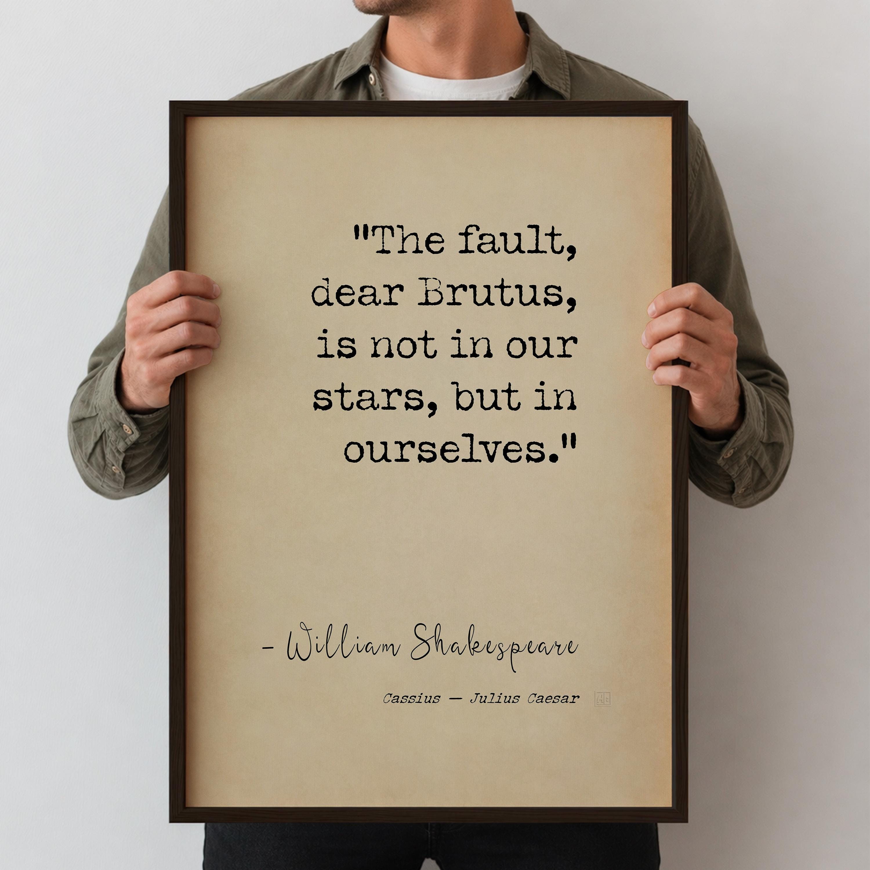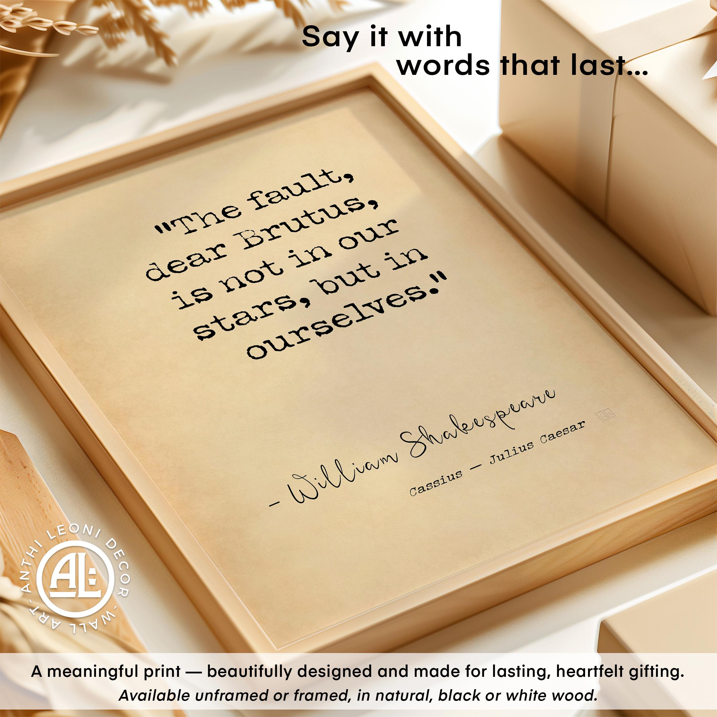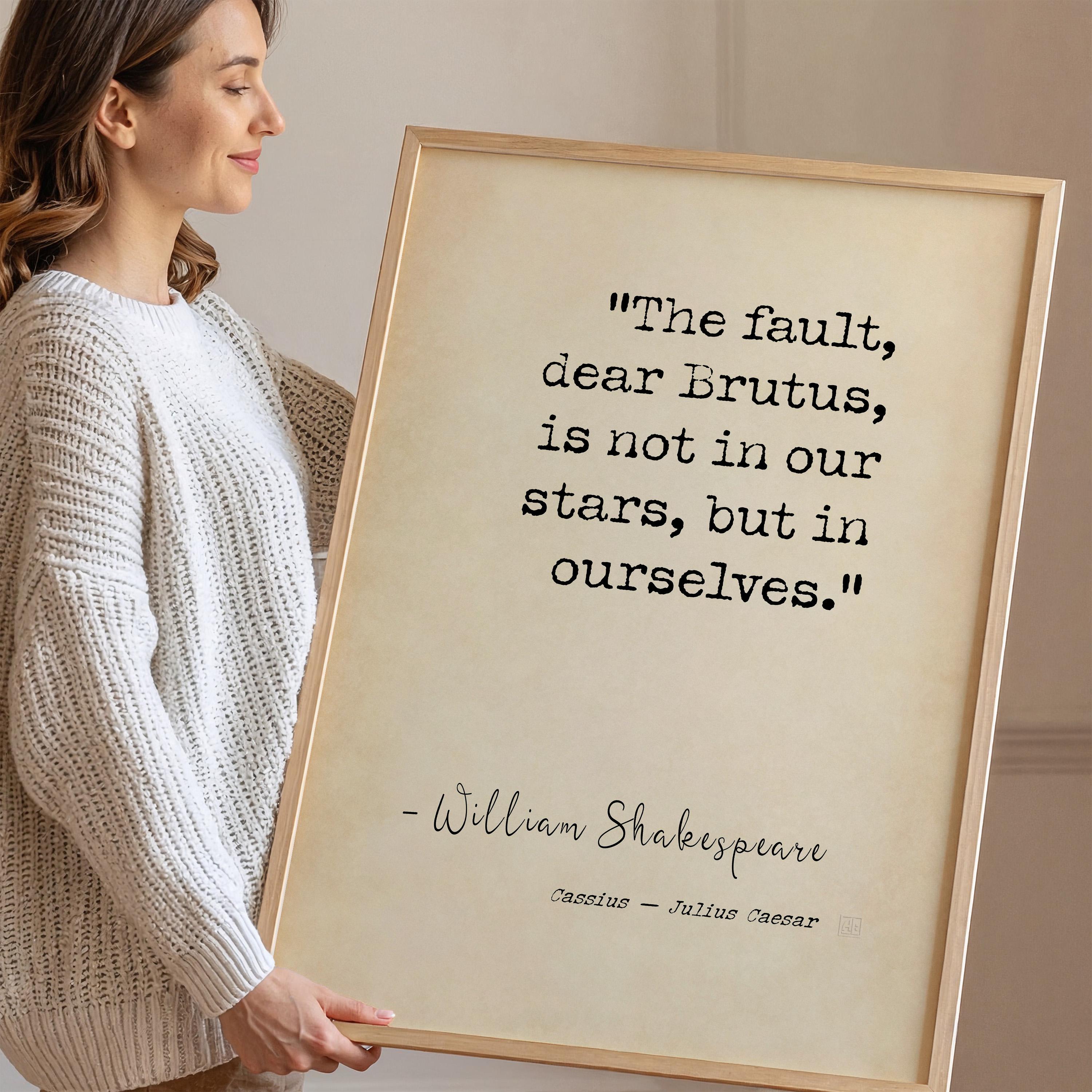 A powerful and timeless Shakespeare quote poster print featuring the line “The fault, dear Brutus, is not in our stars, but in ourselves.” A bold statement of personal responsibility, mindset, and self-mastery — ideal for a study, office, or considered interior.