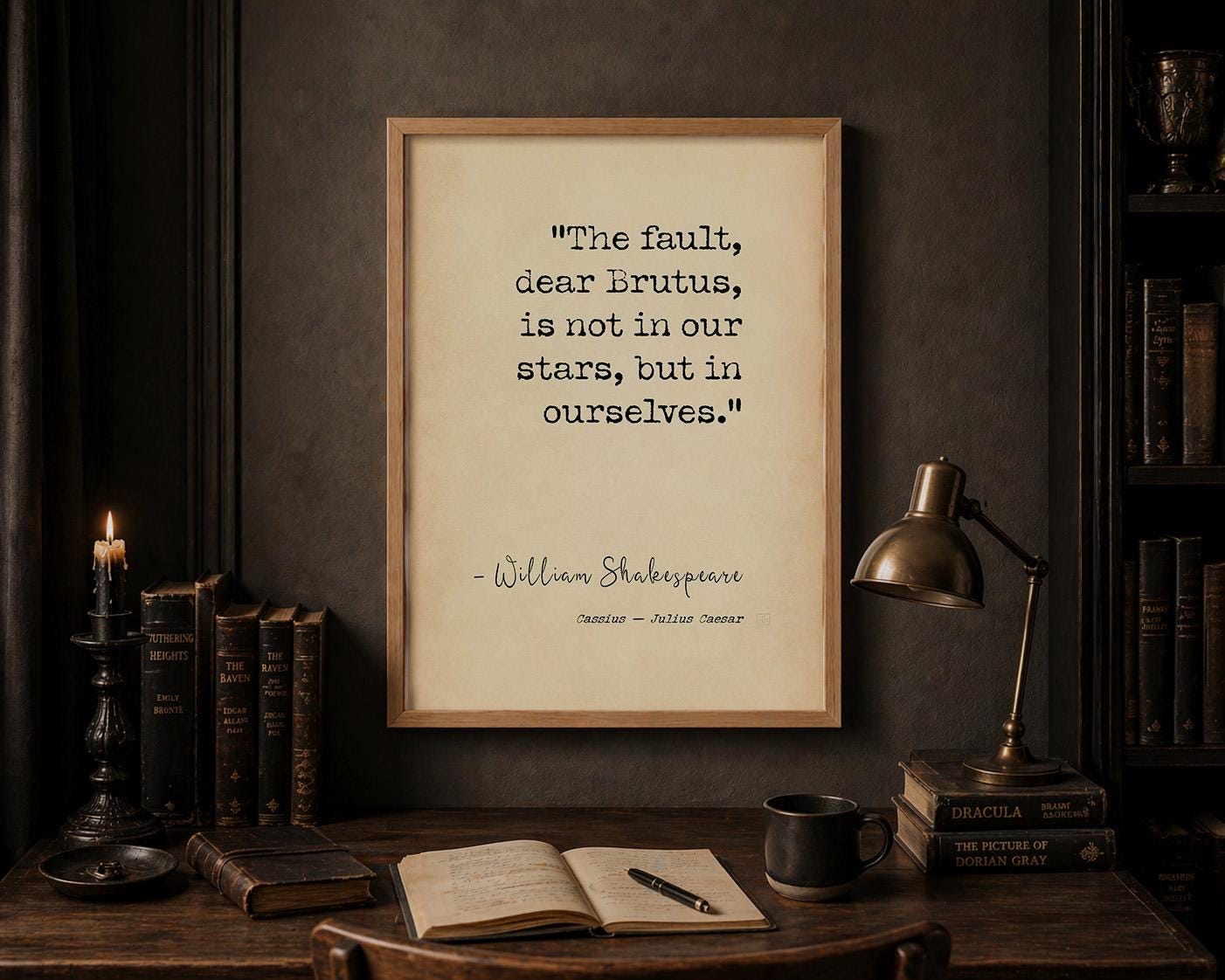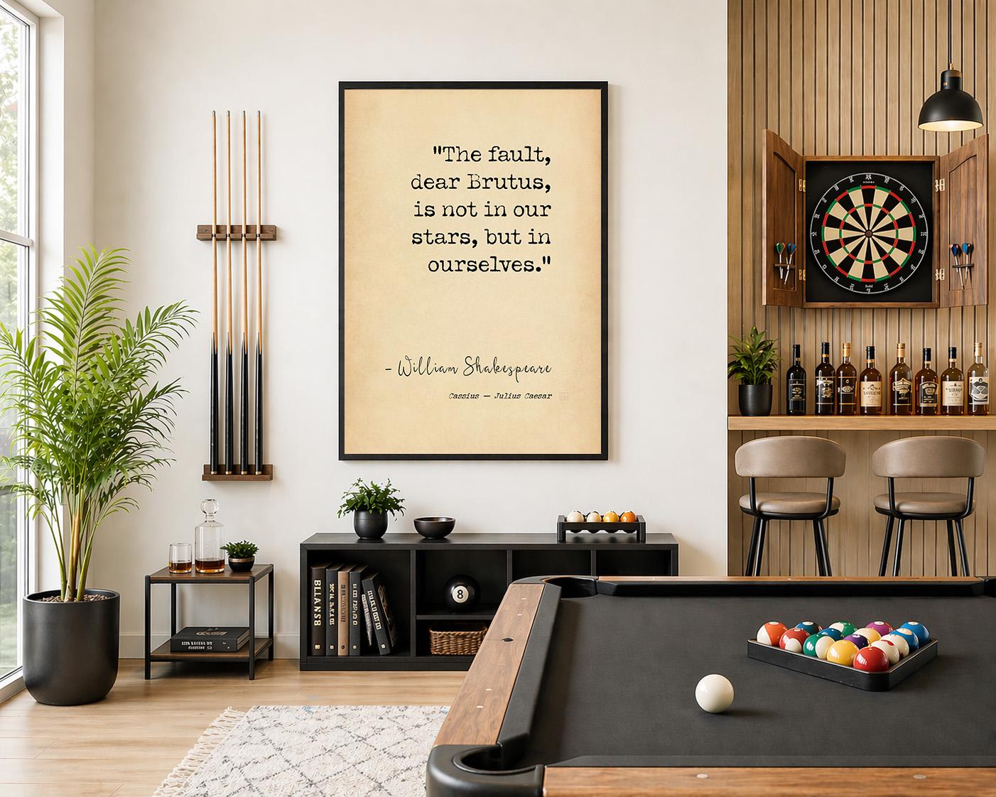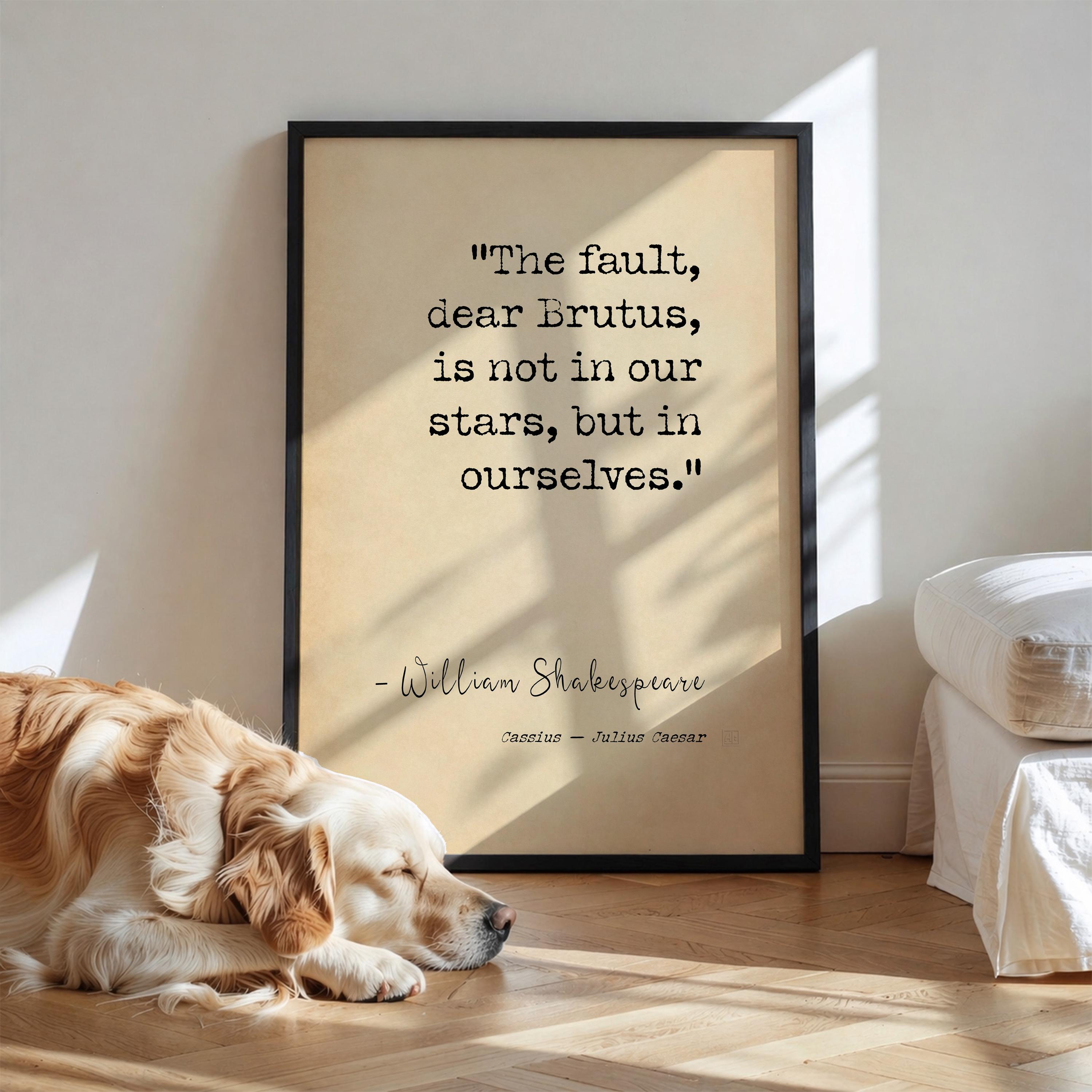A powerful and timeless Shakespeare quote poster print featuring the line “The fault, dear Brutus, is not in our stars, but in ourselves.” A bold statement of personal responsibility, mindset, and self-mastery — ideal for a study, office, or considered interior.