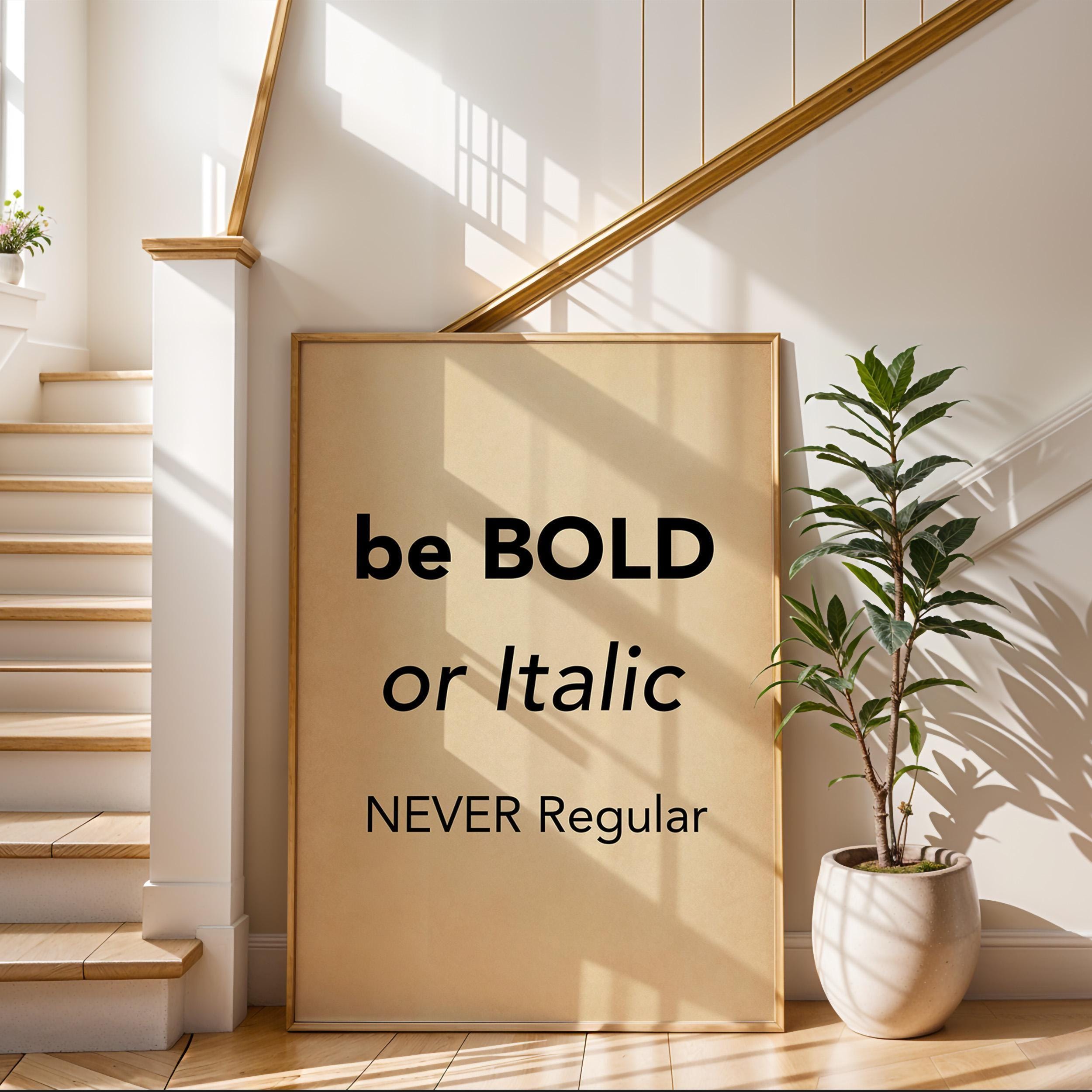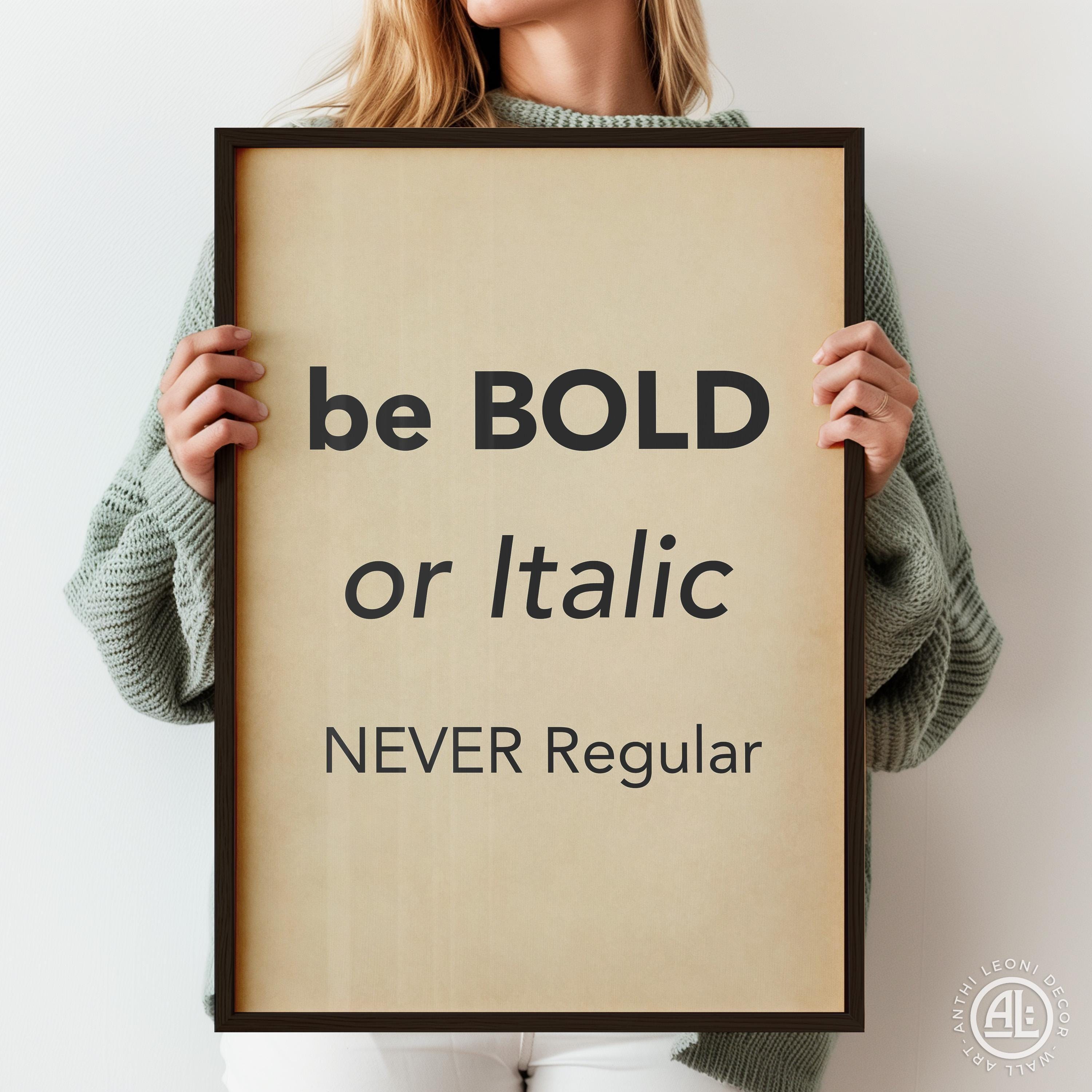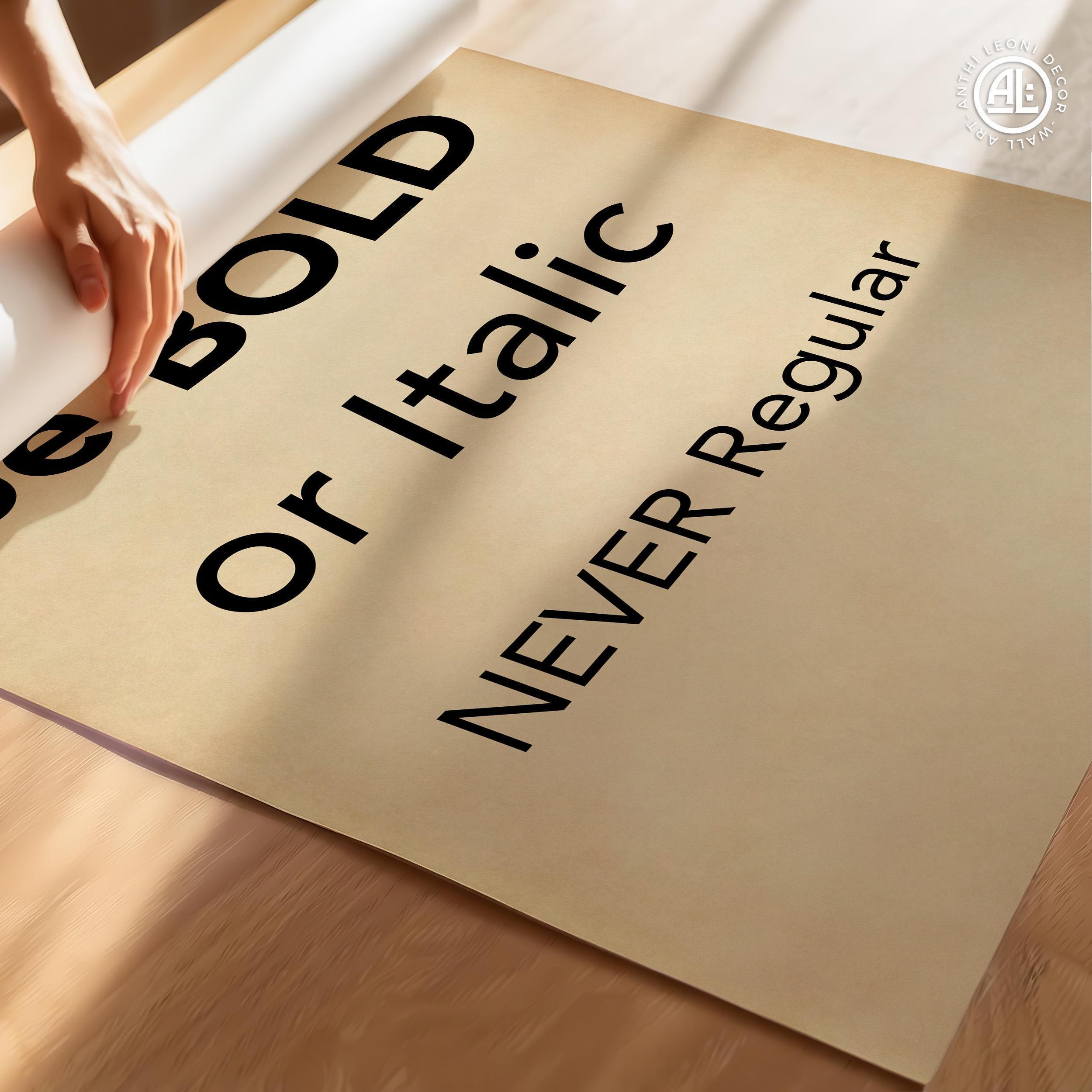 Bring a witty typographic twist to your space with this **"Be Bold or Italic Never Regular"** motivational print, styled with antique typewriter flair. Perfect for lovers of wordplay, fonts, and vintage design, this bold and brilliant piece adds instant character to any wall.