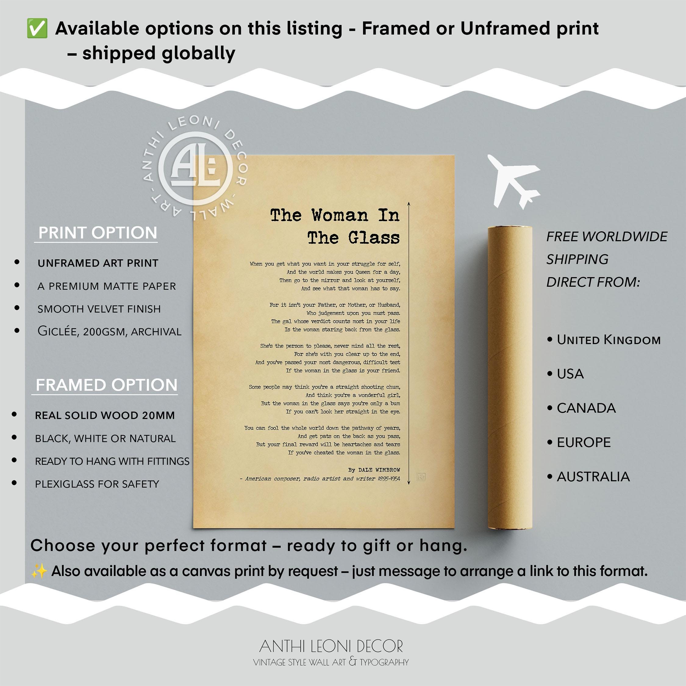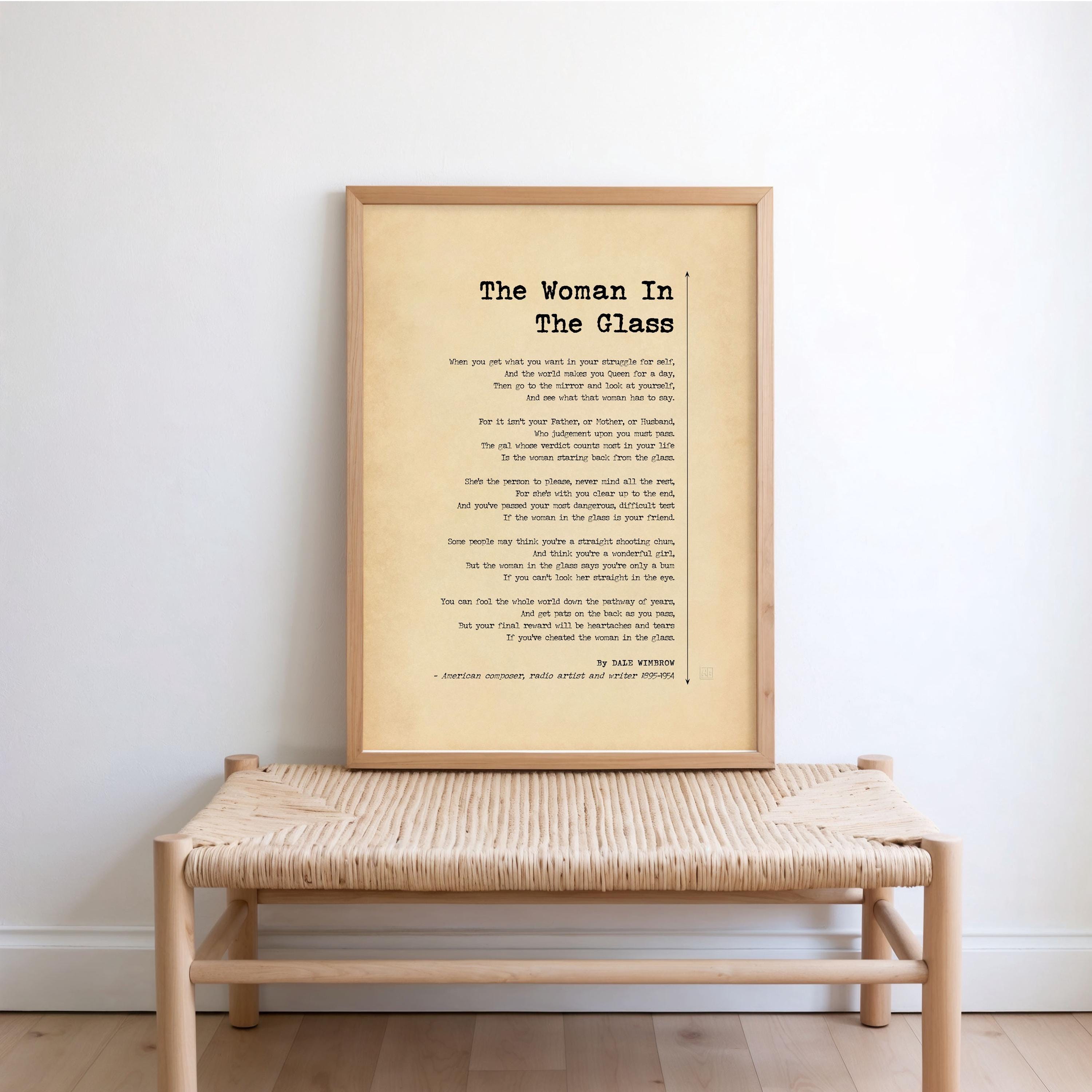 The Woman in the Glass poem by Dale Wimbrow — also known as The Girl or Gal in the Glass and often searched as the mirror poem. Vintage typography poster print for office and home, framed or unframed.