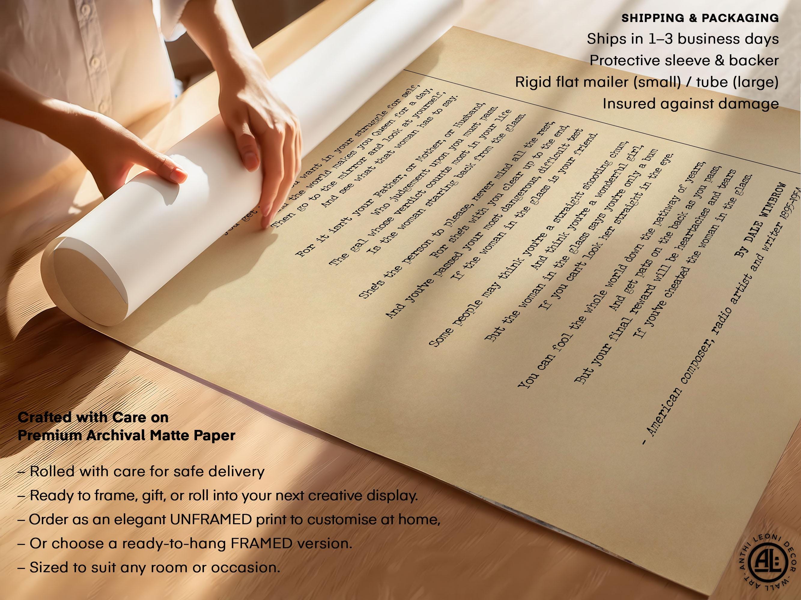 A timeless self-reflection poem about integrity and personal accountability, The Woman in the Glass reminds us the person in the mirror is the truest judge. This elegant vintage typography poster keeps the full text clear and readable, making thoughtful office wall art for a study, home office or library and a daily prompt to lead with character. A meaningful graduation, promotion and new job gift — and a popular choice for female lawyers, mentors and managers who value resilience and honesty. Choose your size and frame and we’ll print and ship directly from the nearest facility.